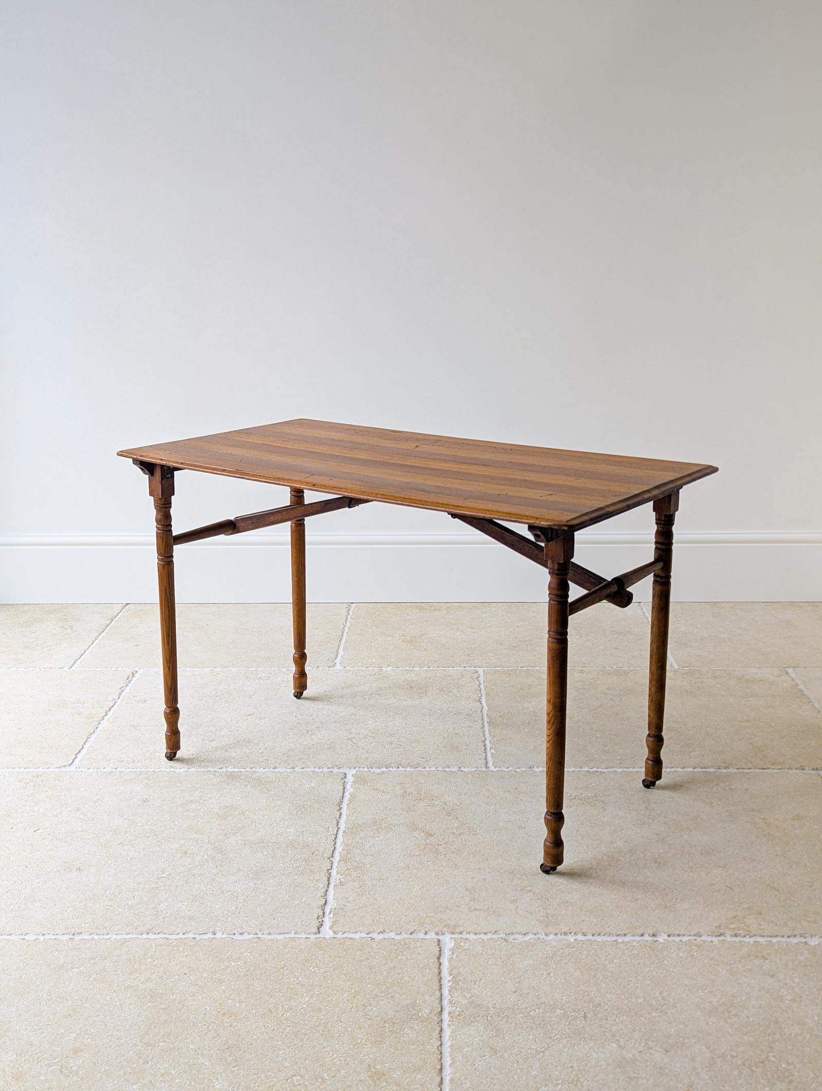 An Edwardian folding table constructed in oak, with a rectangular top of alternating light and dark planks within a moulded edge, set over a well-designed folding underframe with sprung stays and a central pivoting brace supporting two hinged turned leg frames terminating in original castors.