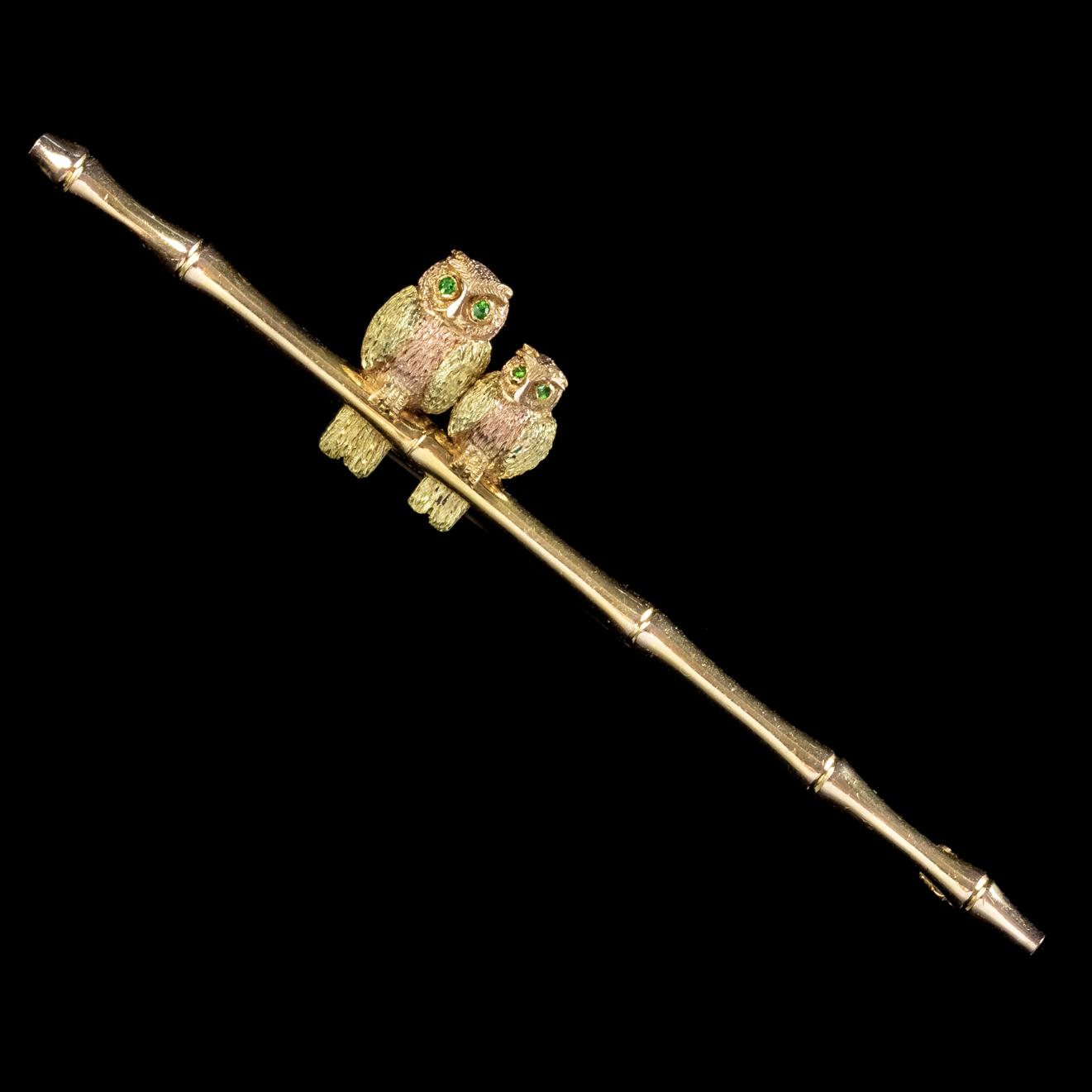 Antique Edwardian Owl Brooch 15ct Gold Green Garnet Eyes c.1902