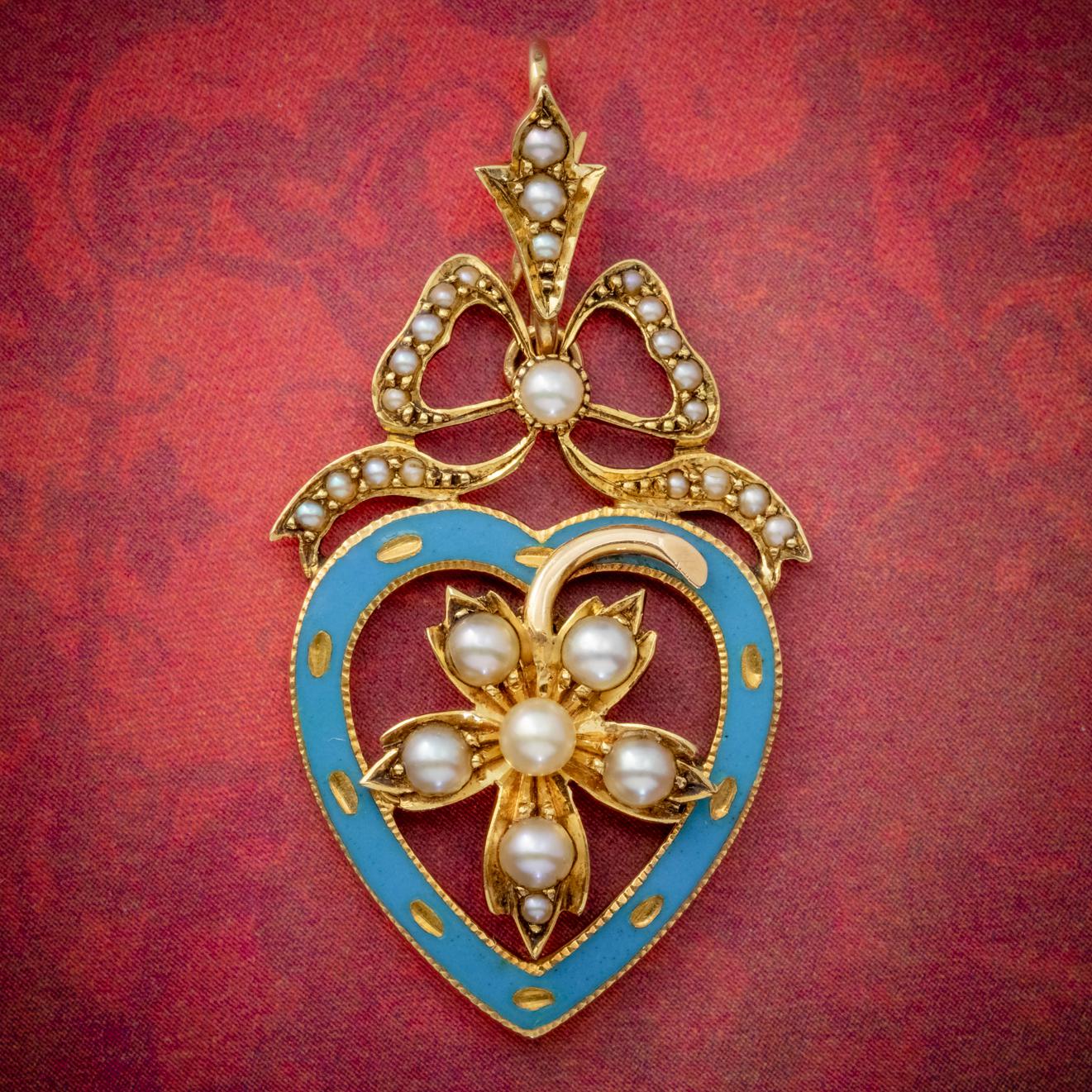 Antique Edwardian Pearl Heart Pendant Brooch 15ct Gold Blue Enamel c.1905 Boxed