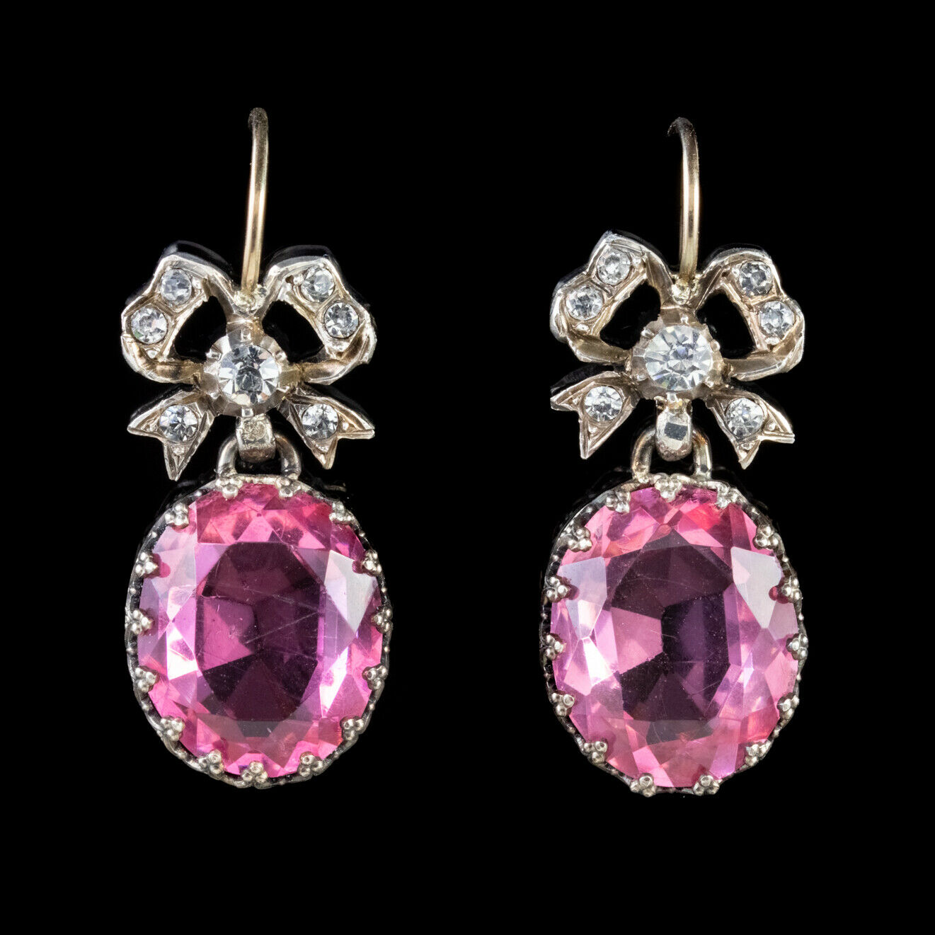 Antique Edwardian Pink & White Paste Gold Silver Earrings Bow Tops c.1910