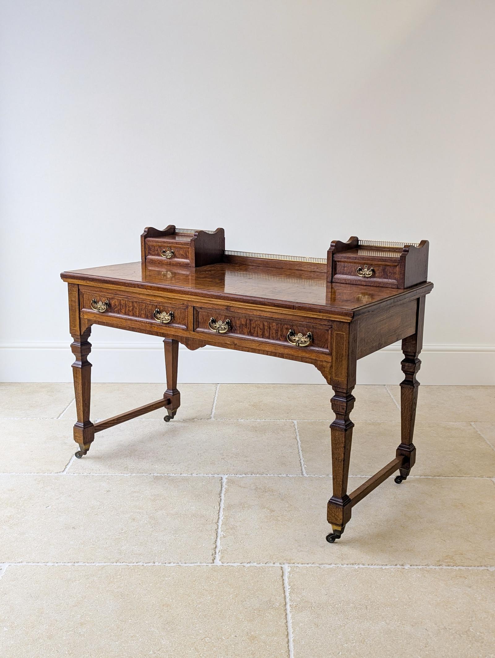 An Edwardian oak writing table, the top and drawer fronts finely veneered in richly figured pollard oak. The writing surface is arranged with three rectangular line-inlaid reserves and fitted with two removable sliding stationery drawers running in precisely cut grooves, with a decorative brass gallery rail to the rear.