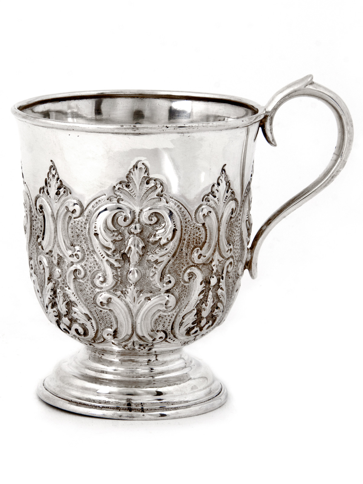 Antique Edwardian Silver Chased Christening Mug with a Scroll Handle (1 of 6)