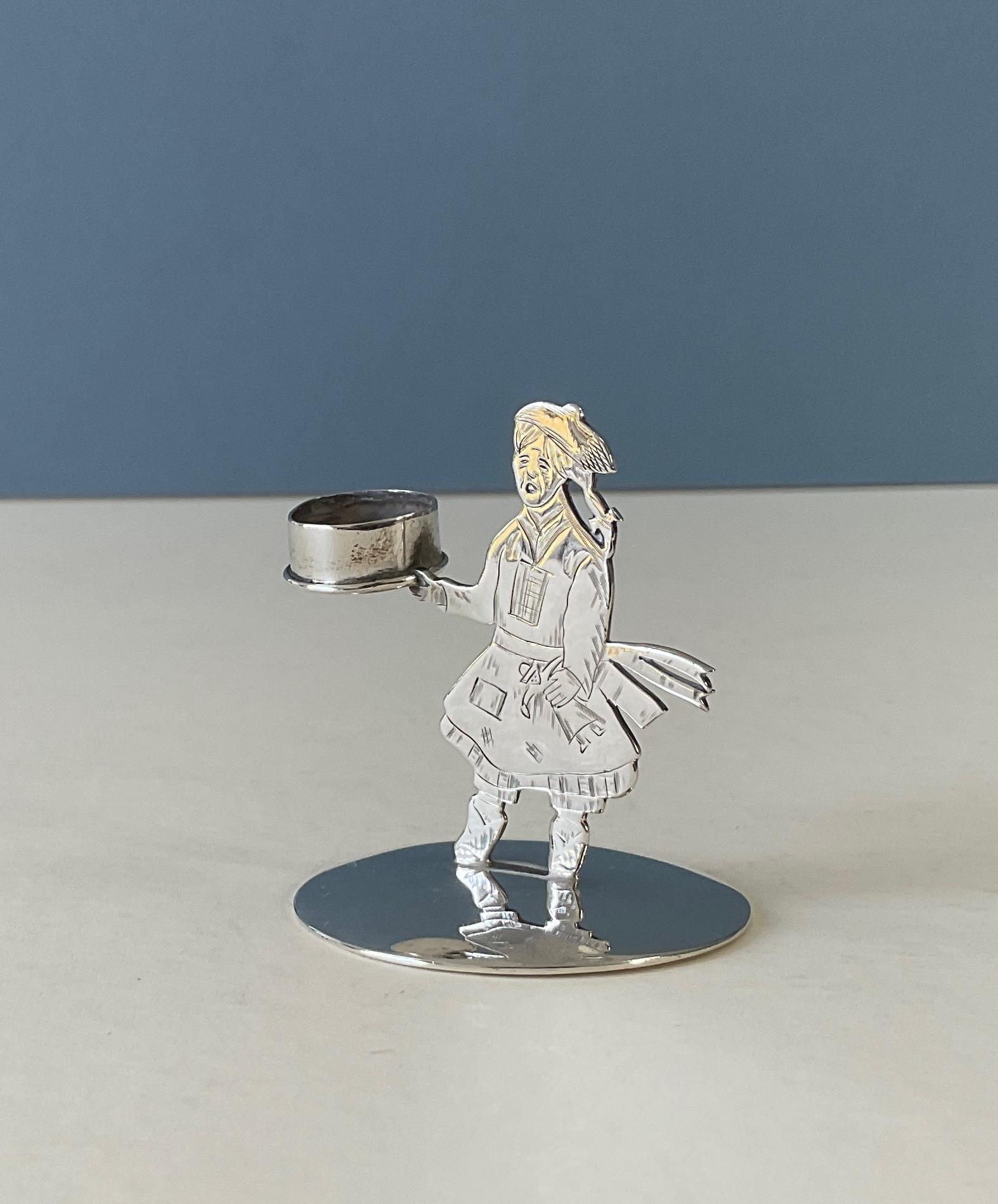 This one is hallmarked for Chester 1905 Sand features a young girl holding a doll, complete with plaits, a bow and a hat. Her belt, fanning out behind her, forms the handle to the chamberstick. The detailing is crisp, as are the hallmarks. The actual taper/candle holder is a little bent and squashed, but still perfectly serviceable.