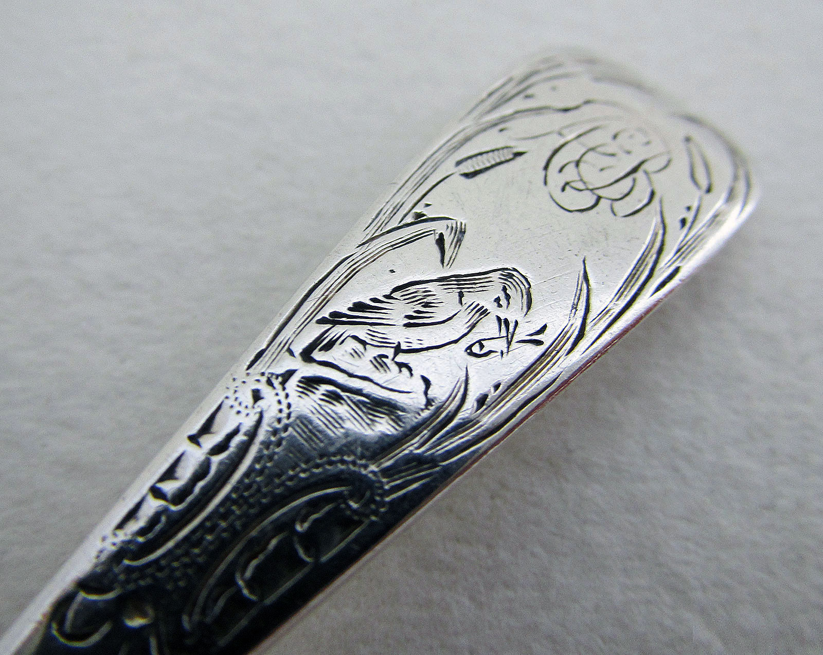 Antique Edwardian Solid Sterling Silver English Engraved 'Kingfisher' Tea Spoon, Josiah Williams Co of Bristol 1907