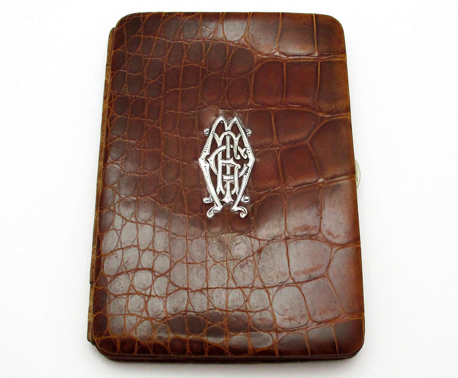 Antique Edwardian Solid Sterling Silver Mounted Crocodile Skin Leather Wallet Purse Card Stamp Case c.1910