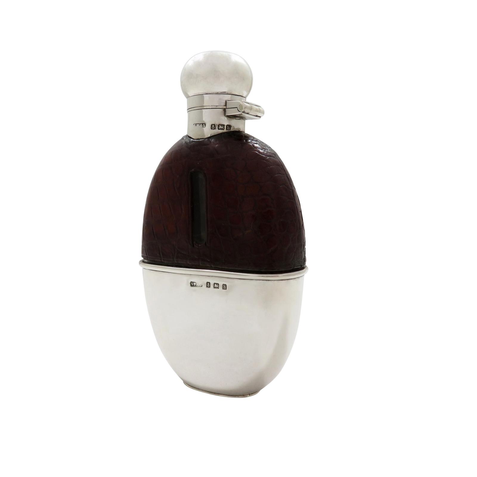Antique Edwardian Sterling Silver & Crocodile Leather Hip Flask 1907