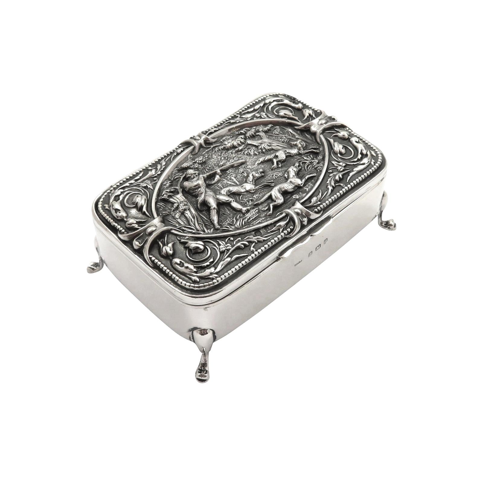 Antique Edwardian Sterling Silver Trinket Box with Hunting Scenes 1908