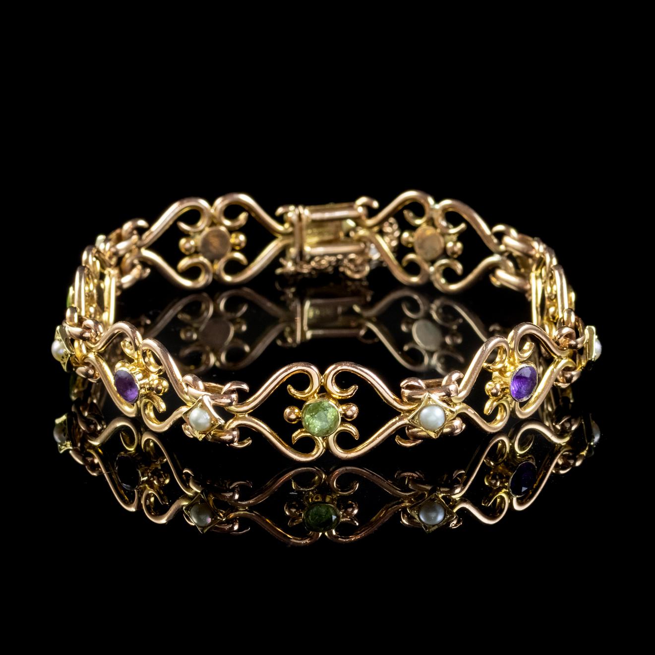 Antique Edwardian Suffragette Bracelet 15ct Gold Peridot Pearl Amethyst c.1910
