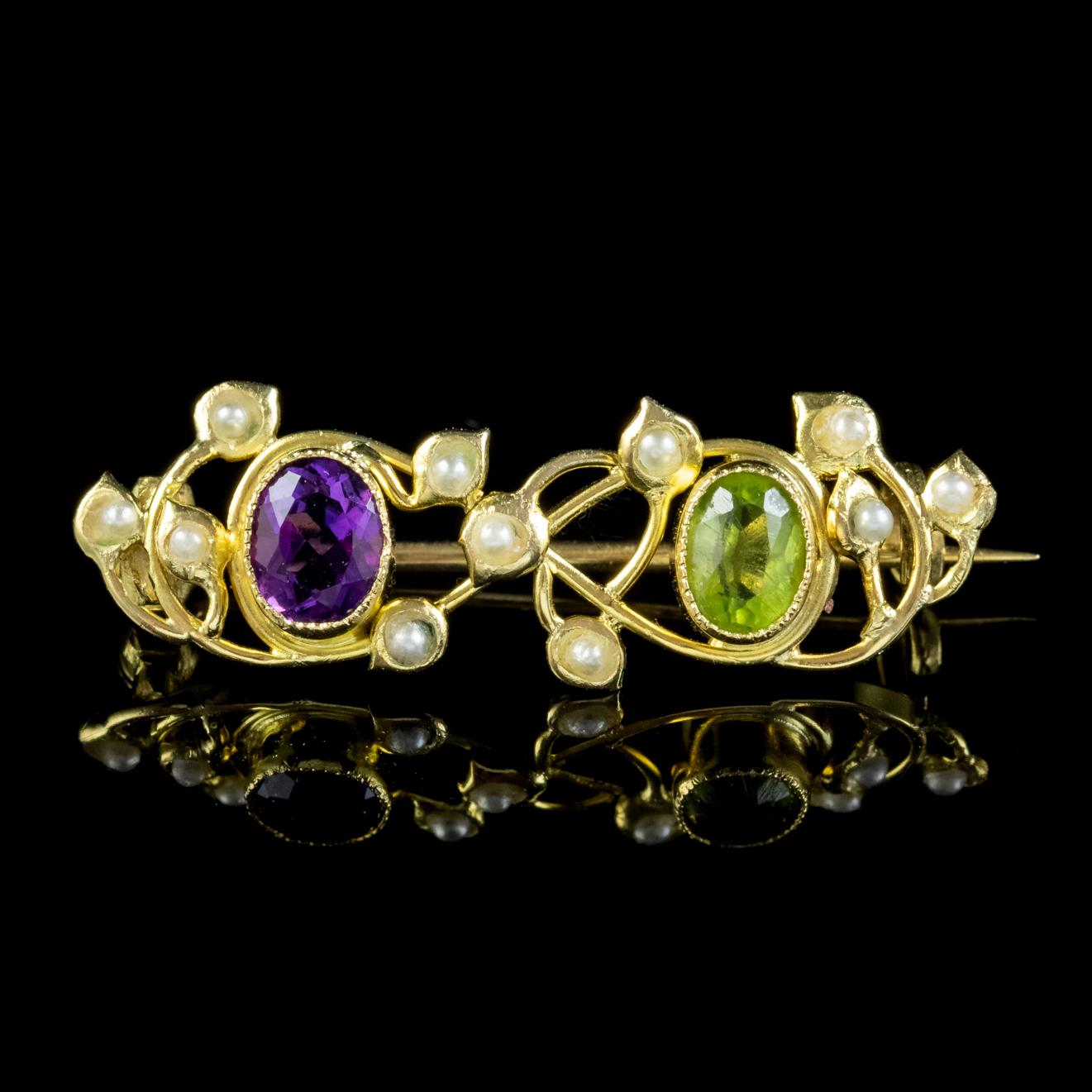 Antique Edwardian Suffragette Brooch Amethyst Pearl Peridot 18ct Gold c.1910