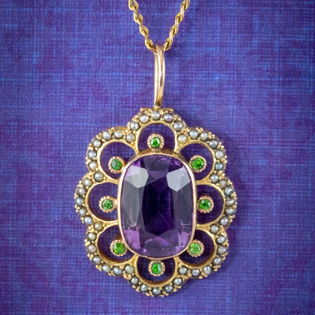 Antique Edwardian Suffragette Pendant Necklace Amethyst Peridot Pearl 9ct Gold c.1910