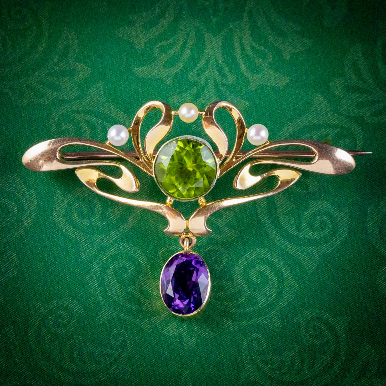 Antique Edwardian Suffragette Peridot Amethyst Brooch 15ct Gold c.1910