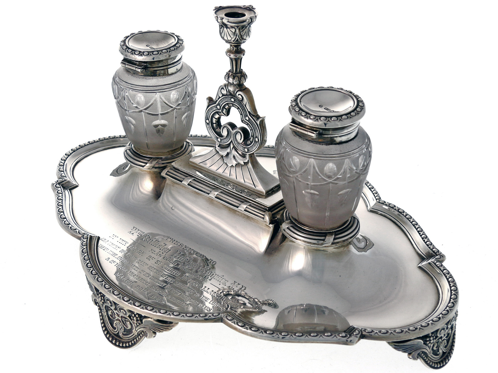 Antique Elkington Silver Ink Stand with Two Glass Inkwells