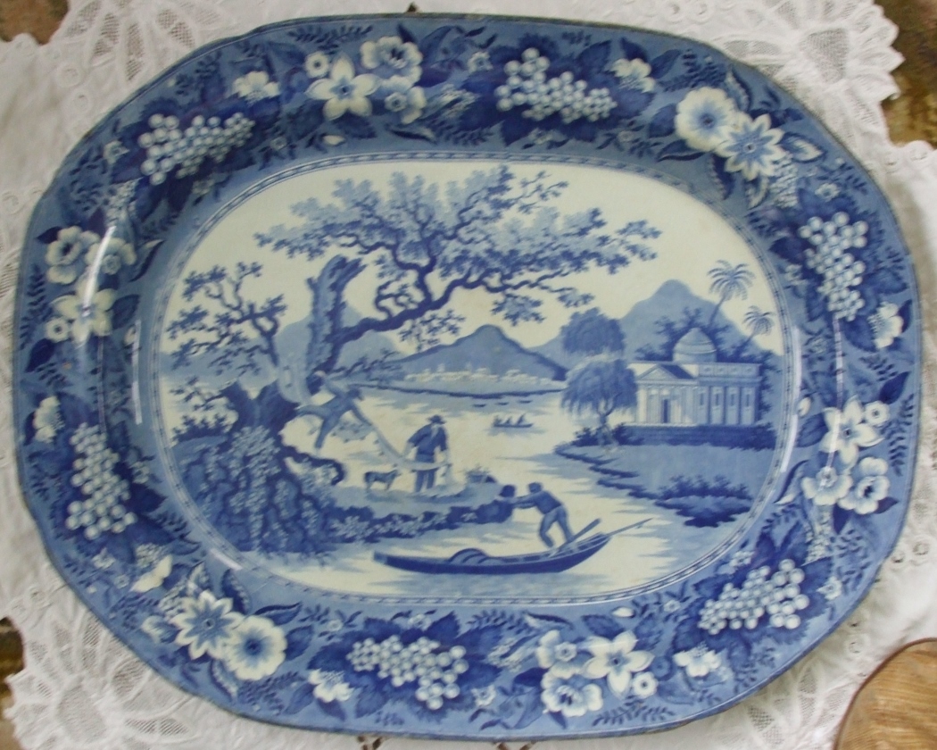 Antique English Georgian Blue and White Transfer Pottery Serving Dish / Platter ~ "Fishermen with Nets" Pattern ~ Robert Hamilton of Stoke