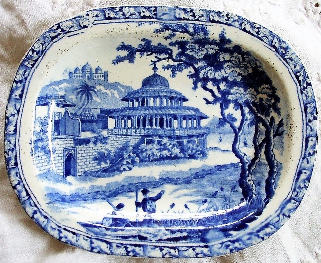 Antique English Georgian Blue & White Transfer "Chalees Satoon" Pattern Pottery Dish ~ Possibly Mayer & Newbold