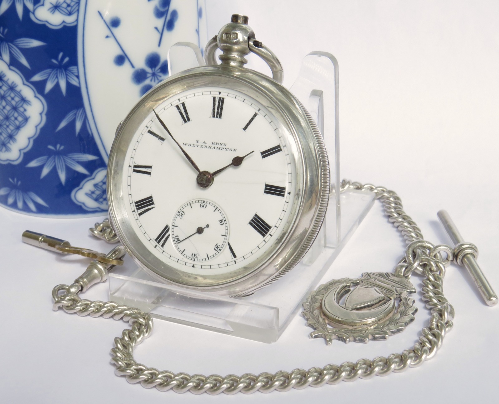 Antique English Silver Pocket Watch & Chain, Retailed by T A Henn Wolverhampton