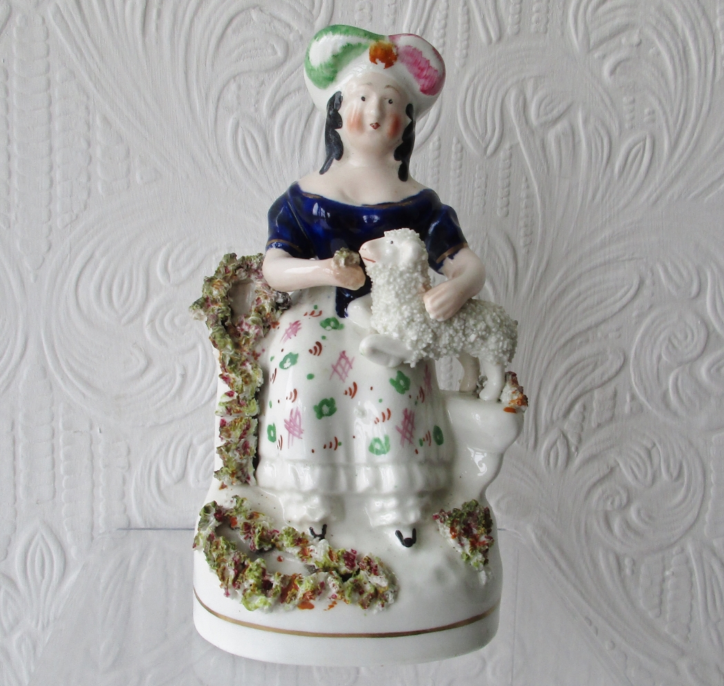 Antique English Victorian Staffordshire Pottery Figure ~ "Seated Girl with Lamb"