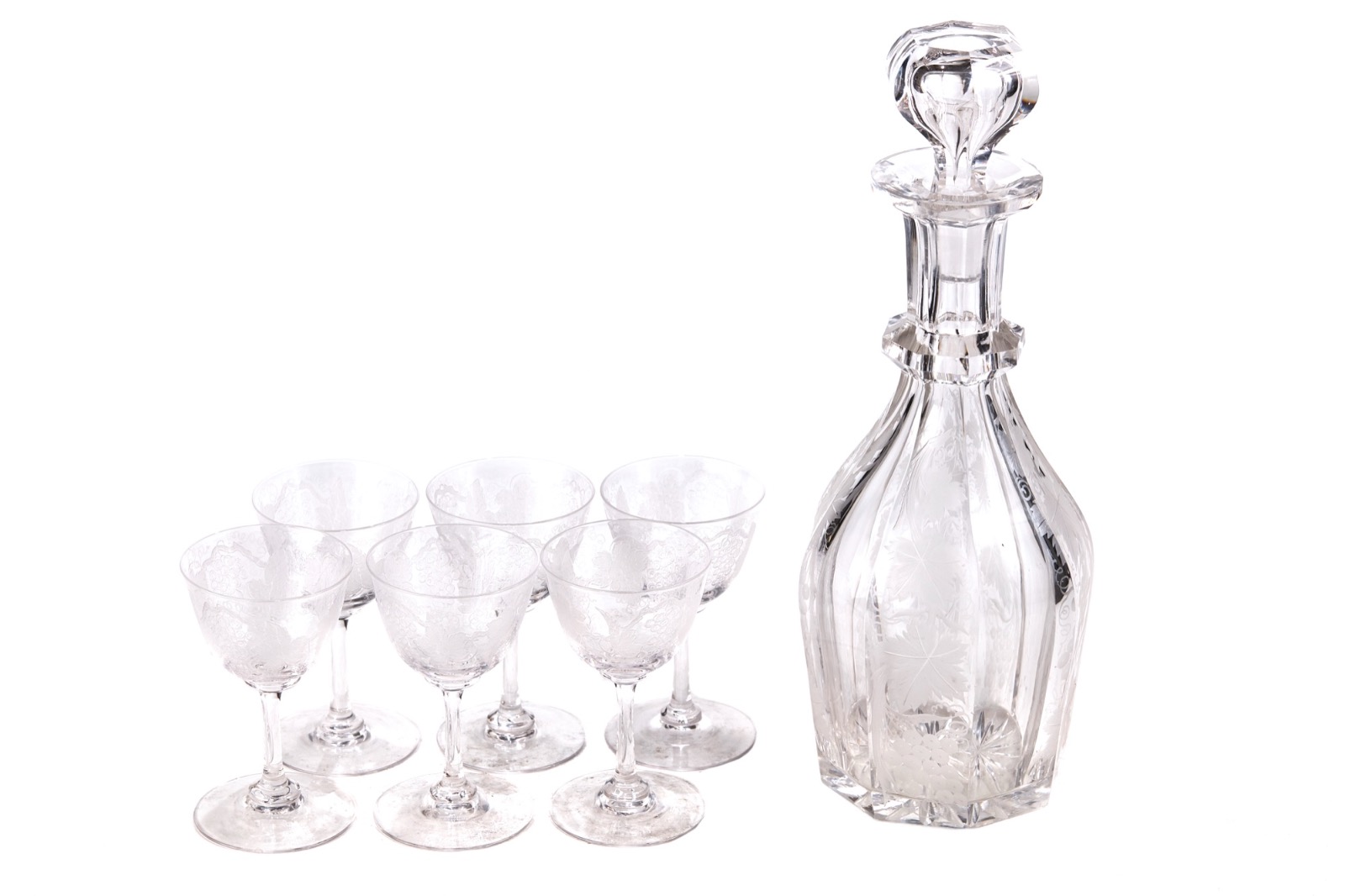 Antique Etched Decanter & 6 Matching Glasses c.1880