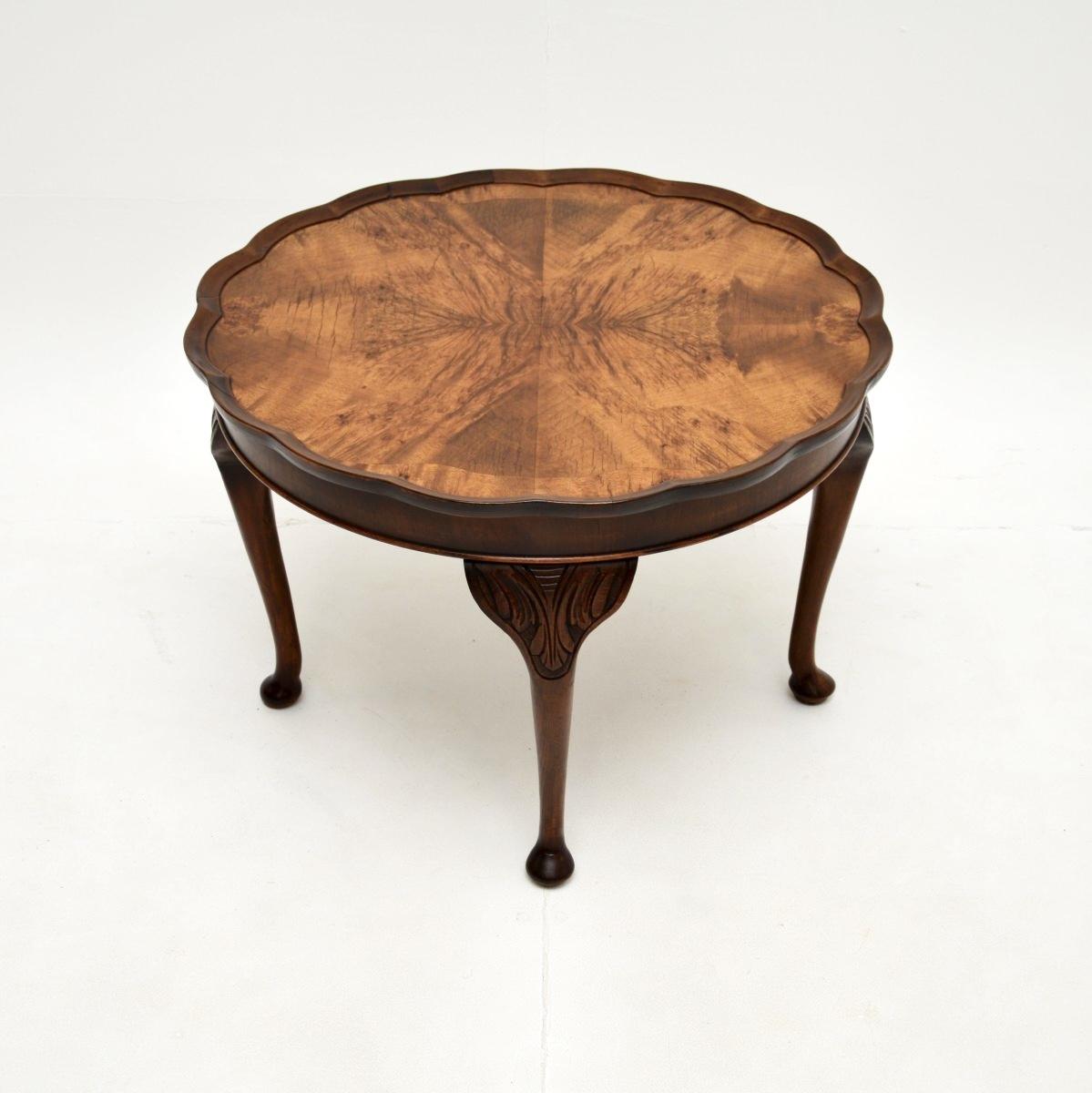 A lovely antique figured walnut pie crust coffee table. This was made in England, it dates from the 1920-30’s.