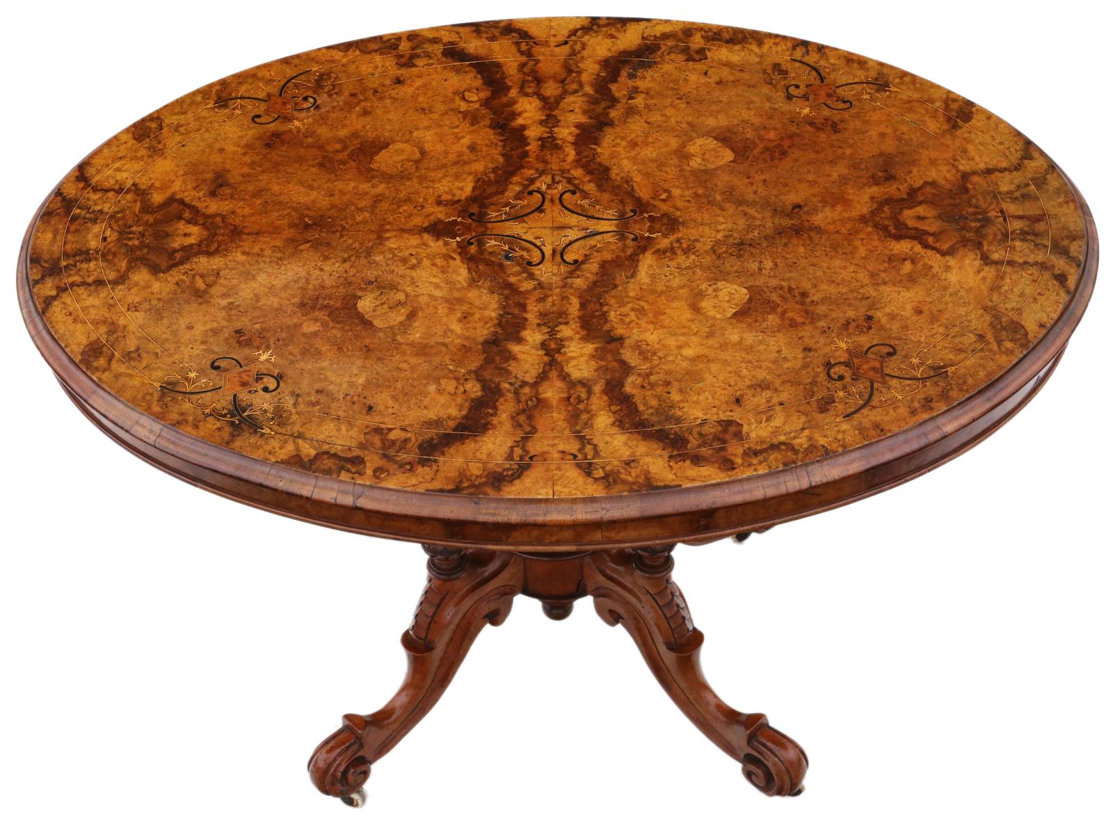 Antique Fine Quality 19th Century Victorian Burr Walnut Marquetry Oval Loo Breakfast Table Tilt Top C1870