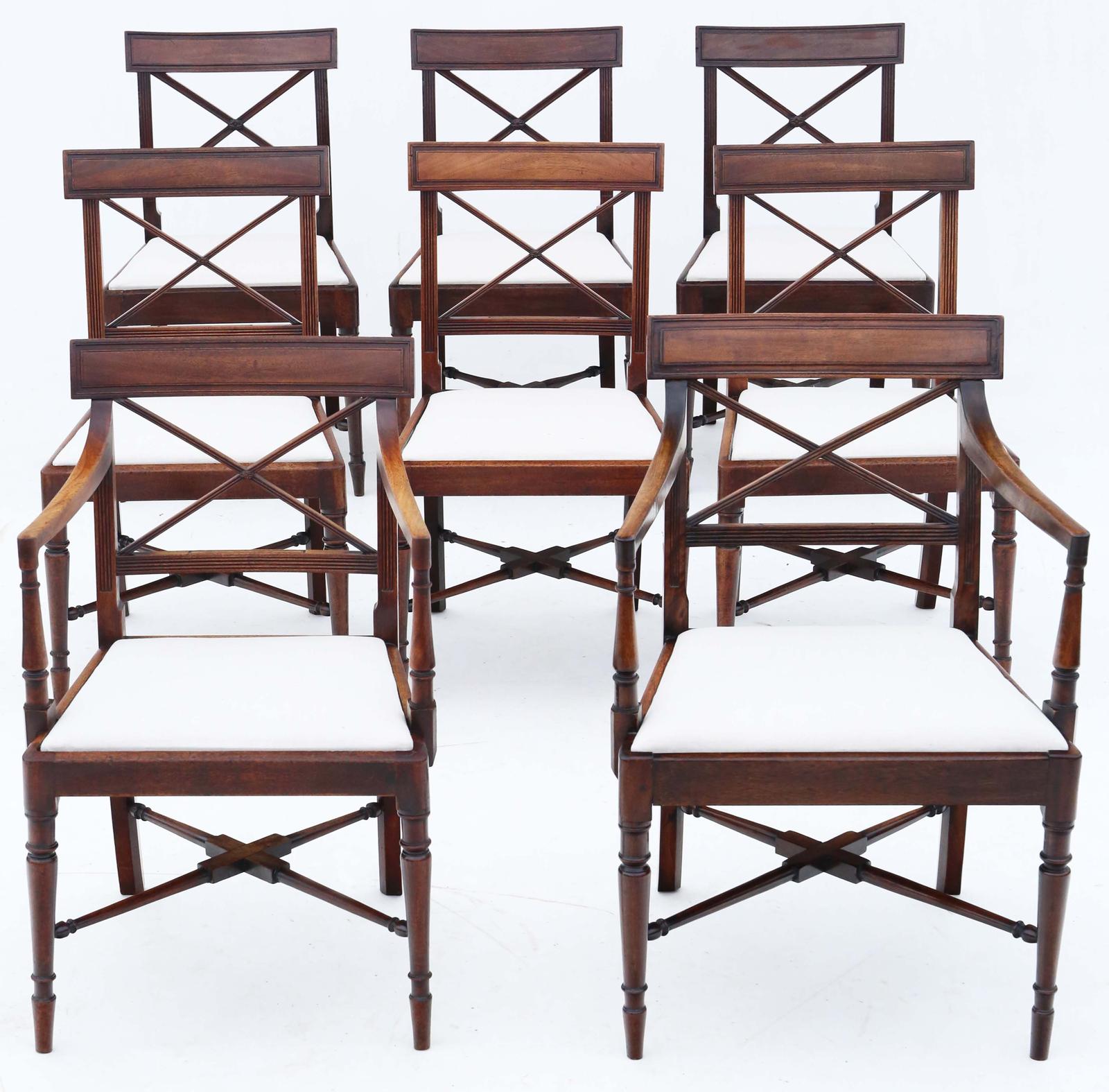 Antique Fine Quality Matched Set of 8 (6 + 2) Early 19th Century Regency Mahogany X-frame Dining Chairs