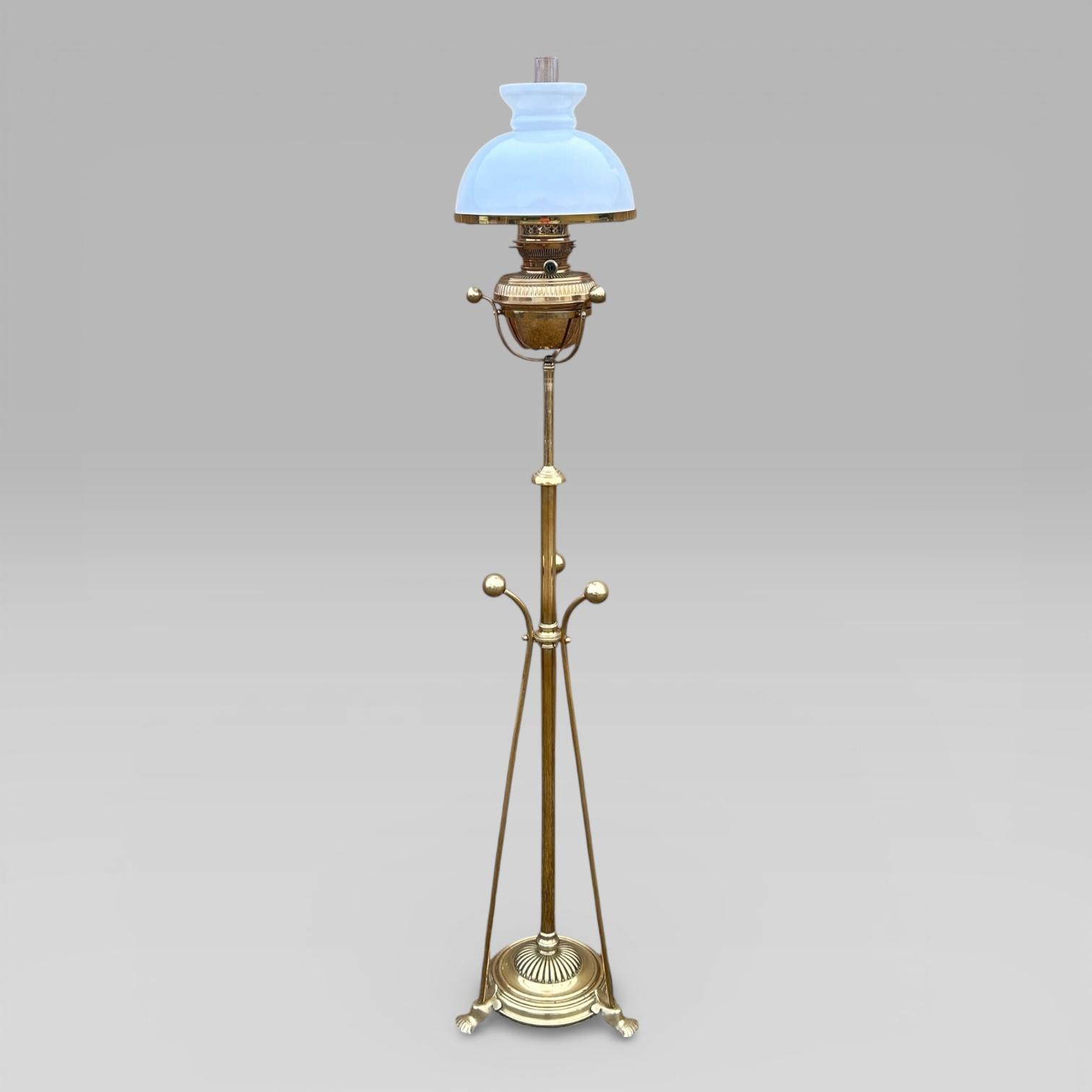 Antique Floor Standing Brass Pole Oil Lamp with White Glass Shade & Tripod Base
