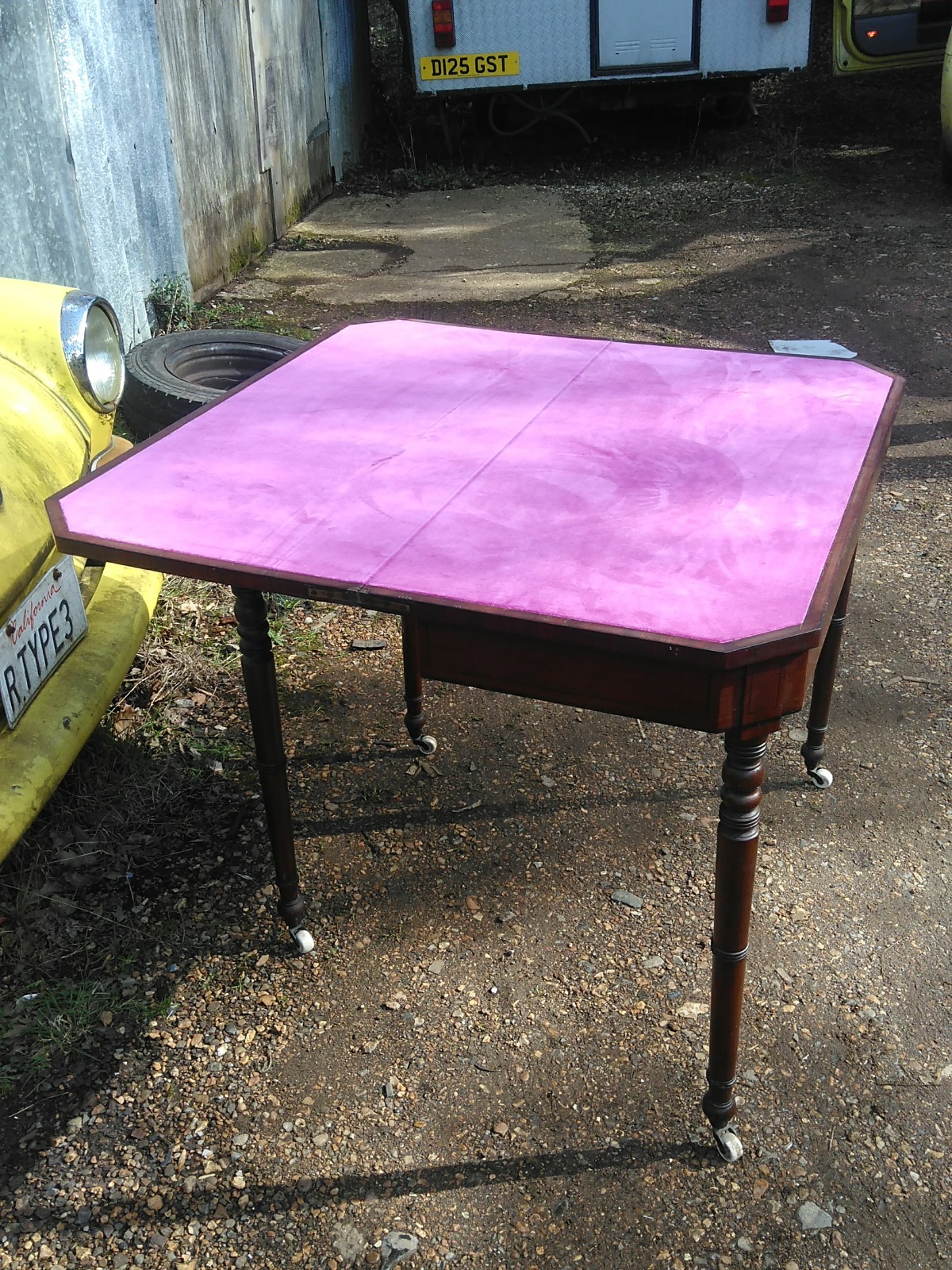 Antique Fold Out Mahogany Card Table with Pink Velvet Baize RAised On Turned Legs with Original Castors
