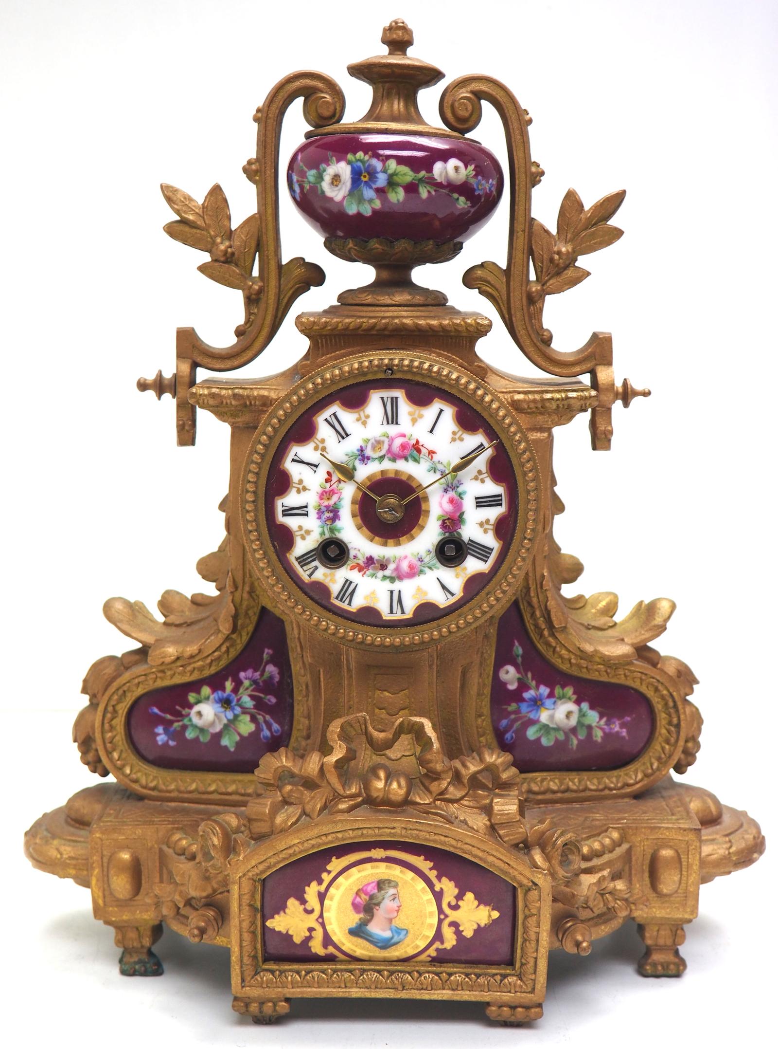 Antique French 8-day Striking Red Sevres Gilt Mantle Clock c.1880