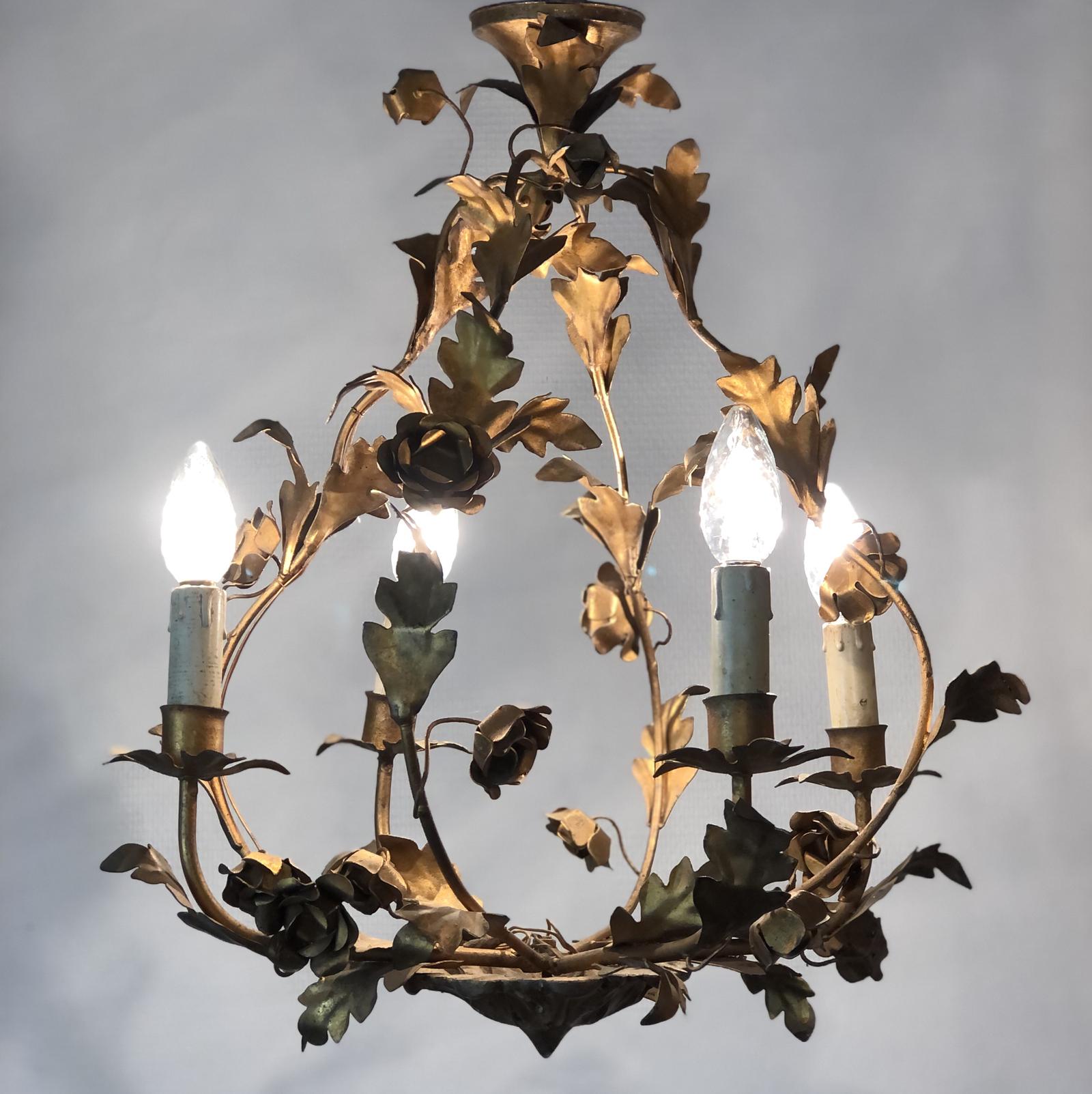 Antique French Birdcage Style Gilt Toleware Ceiling Light Chandelier With Roses