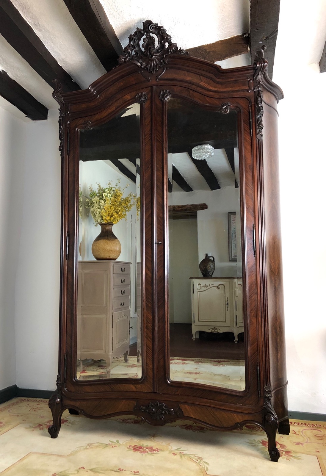 Antique French Bombe Style Mirrored Double Armoire Wardrobe Linen Cupboard