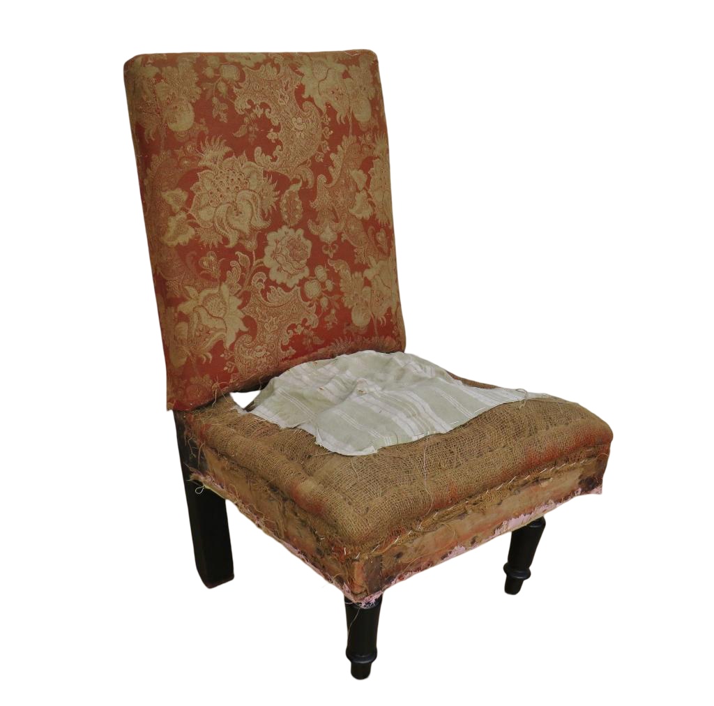 Small sound and sturdy 19th century French deconstructed Napoleon III boudior, nursing, slipper chair on ebonised legs for re-upholstery.