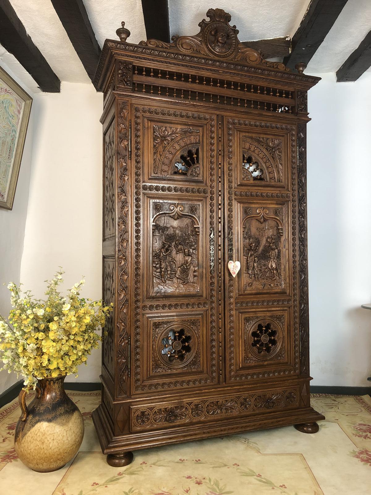 Antique French Carved Breton Armoire Housekeepers Cupboard 2 Door Wardrobe