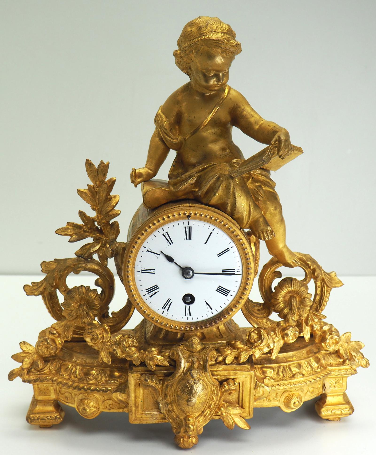 Antique French Cherub Mantel Clock Floral Spray Details 8-day Timepiece