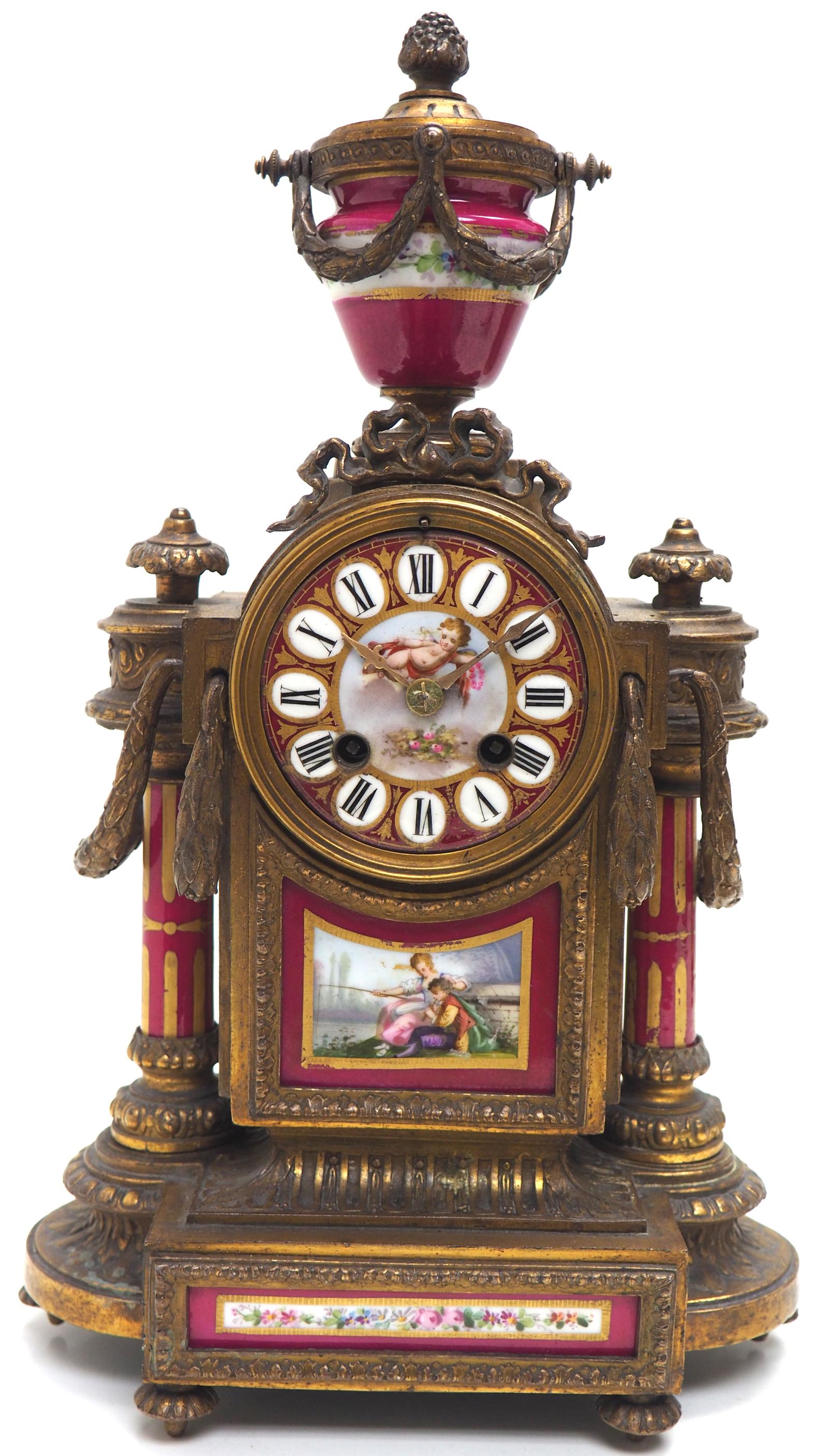 Antique French Cherub Red Sevres 8-day Striking Gilt Mantle Clock c.1870