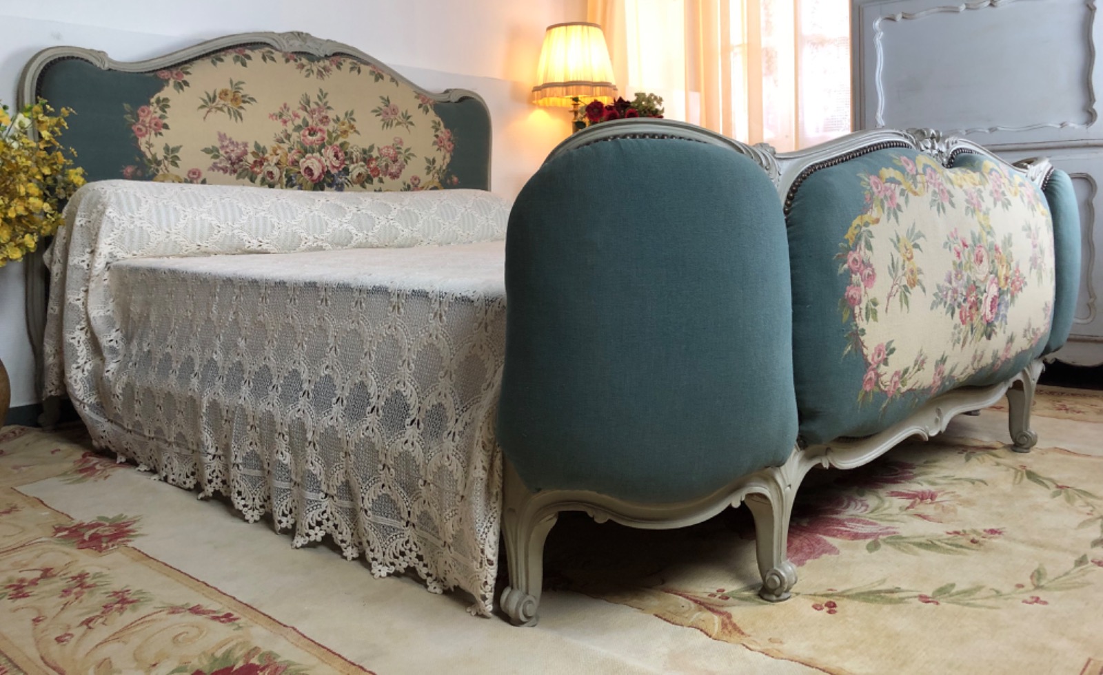 Antique French Demi Corbeille Upholstered King Size Bed Frame