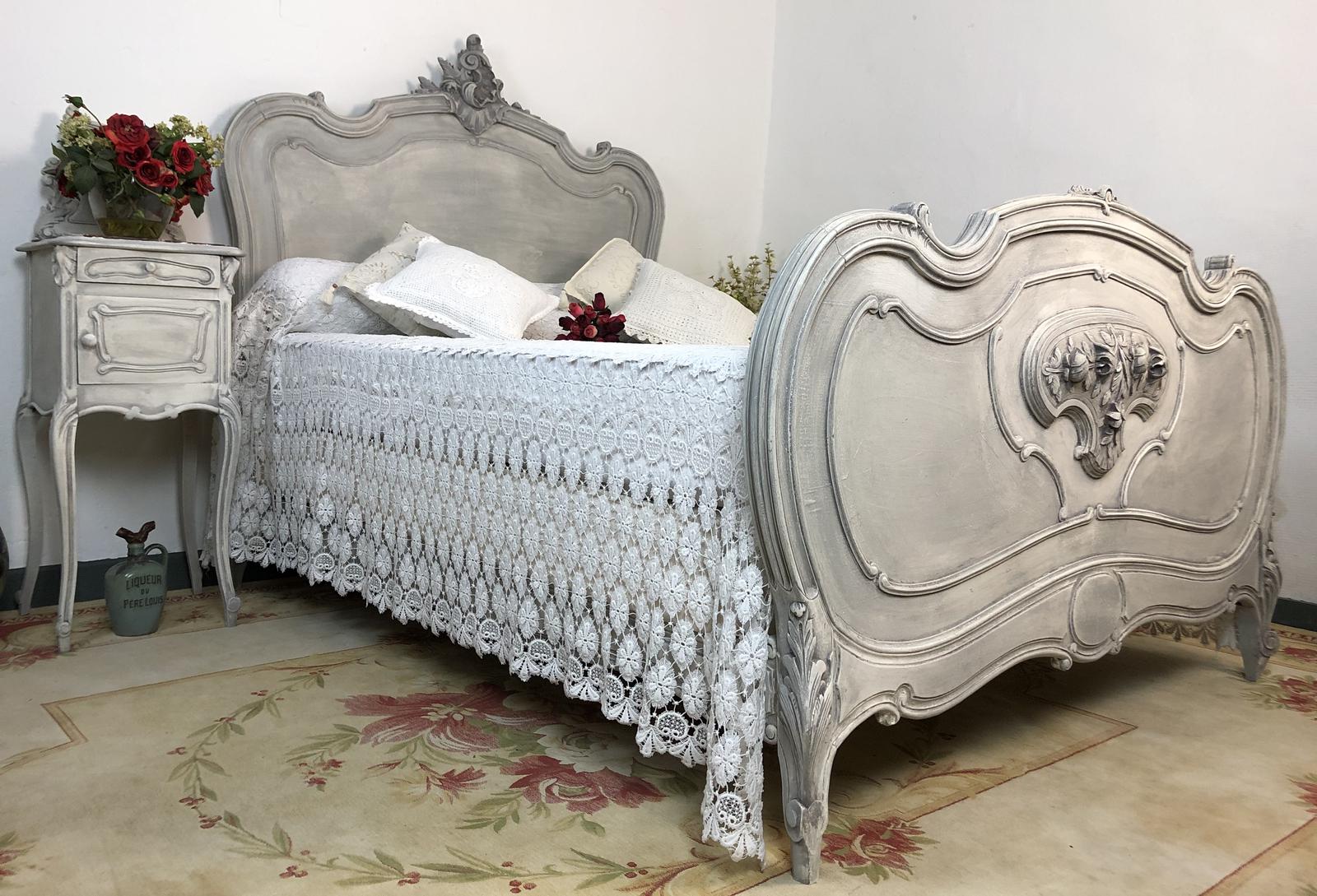 Antique French Double Bed Frame & Pot Cupboard Painted in Weathered Grey