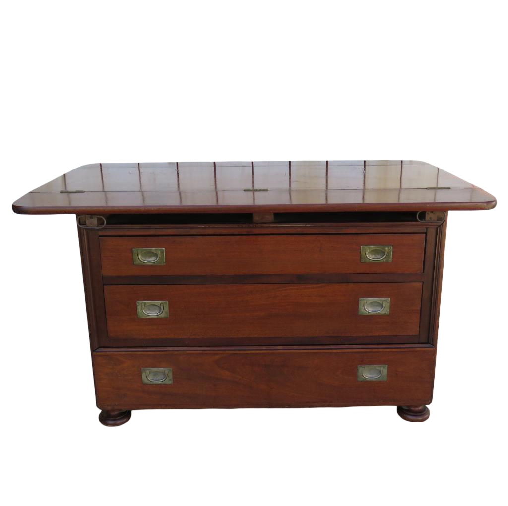 Sound and sturdy 19th century French three drawer mahogany industrial haberdashery drapers commode, chest of drawers with double sided hinged top.