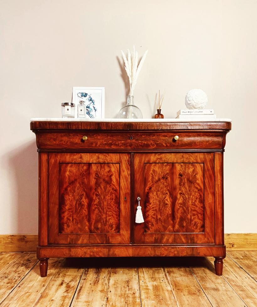 Antique French Flamed Mahogany Sideboard / Cupboard / Marble Linen Cabinet