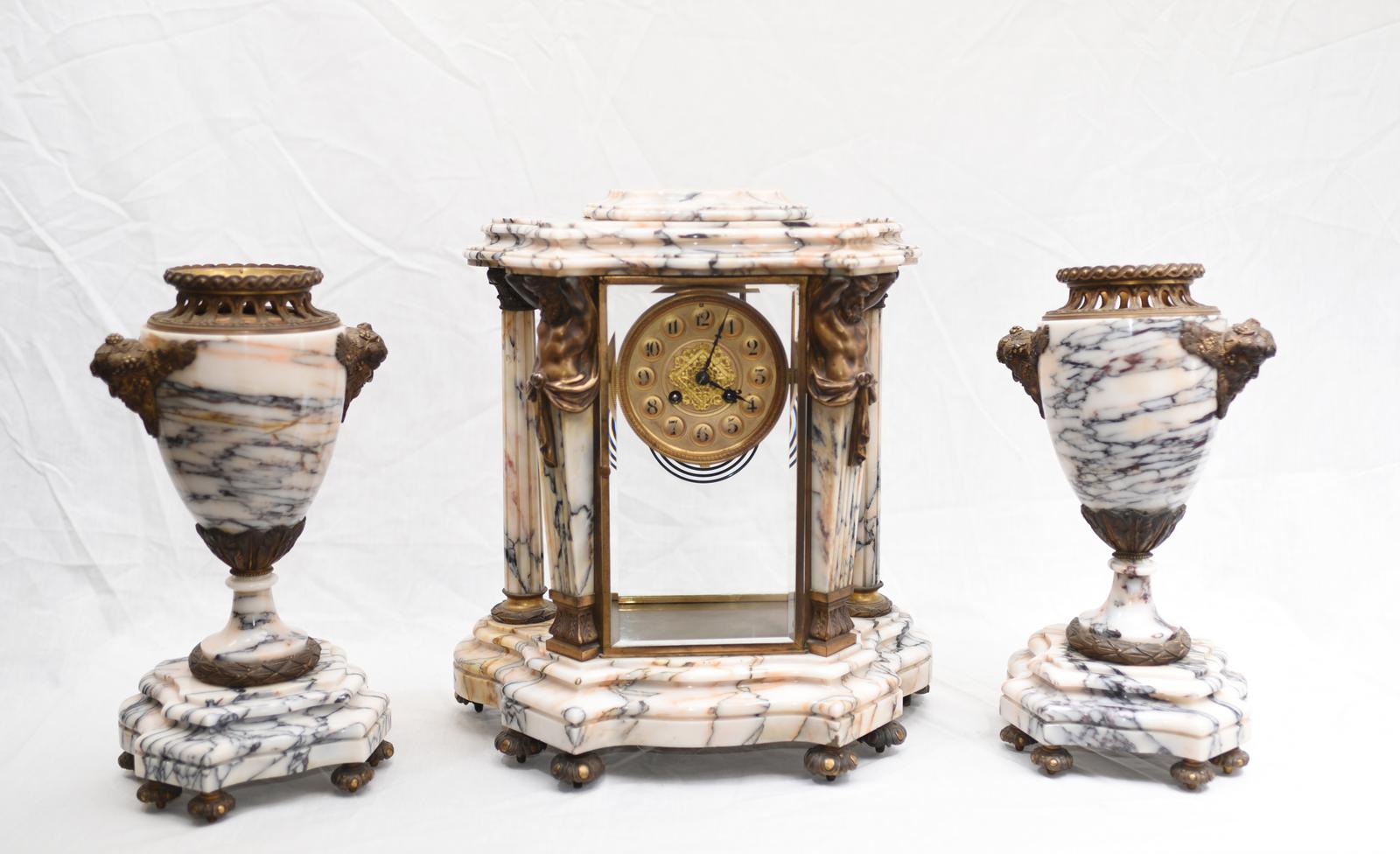 Antique French Gilt Clock Set Garniture Urns with Atlas Figures