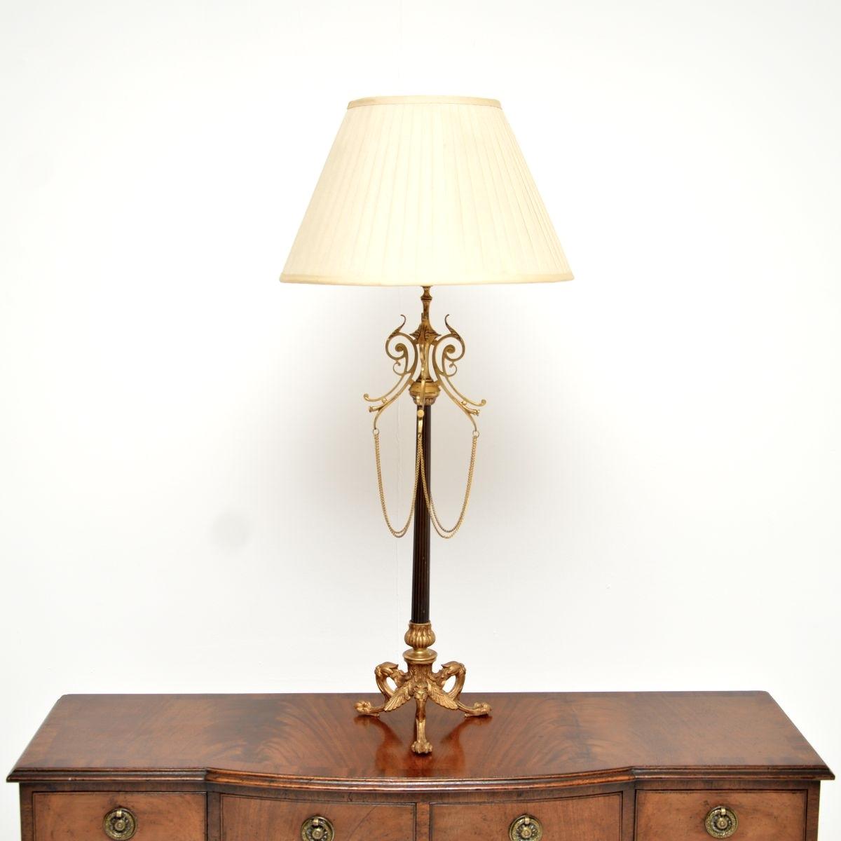 An absolutely stunning antique French gilt metal table lamp, dating from around the 1900-1910 period. This is of exceptional quality, it is large and extremely impressive. It stands on a gorgeous and intricate tripod base that has lions head motifs and hairy paw feet. The dark brown enamelled column is fluted and there is more wonderful gilt metal work at the top of the lamp. We have had this cleaned and re-wired, it is in good working order and is in excellent condition. We have paired it with a lovely pleated tapered vintage shade that is also in nice condition on the outside, there are a couple of tears to the inner lining fabric, not seen from the outside. Width base – 7 inches, 18cm Width shade – 1 inches, 36cm Height to socket – 25 inches, 64cm Height to shade – 31.5 inches, 80cm
