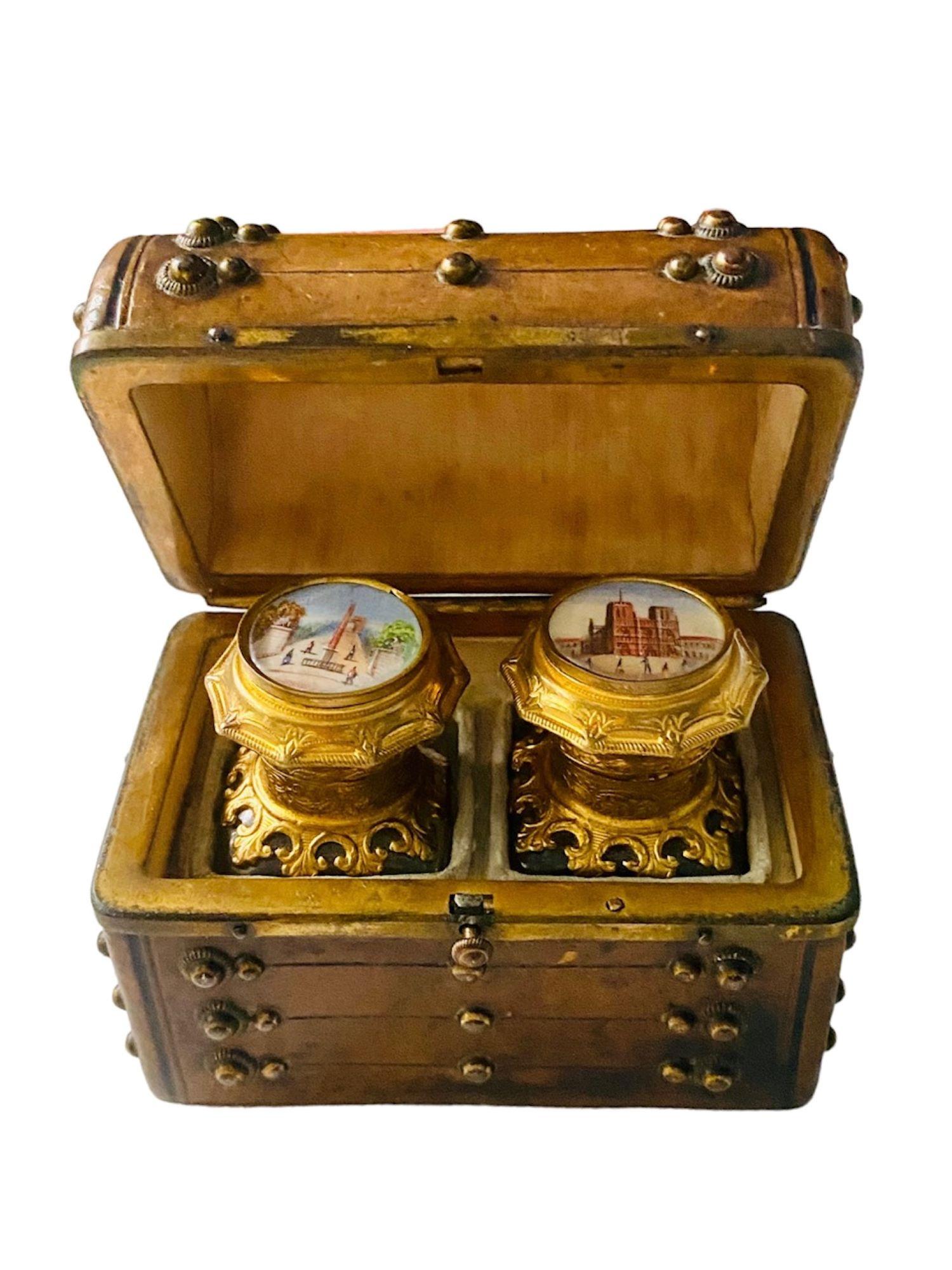 Antique French Grand Tour Souvenir Pair of Perfume Scent Bottle Gilt Ormolu Mount & Eglomise Miniature Paintings in Casket c.1860 (1 of 10)