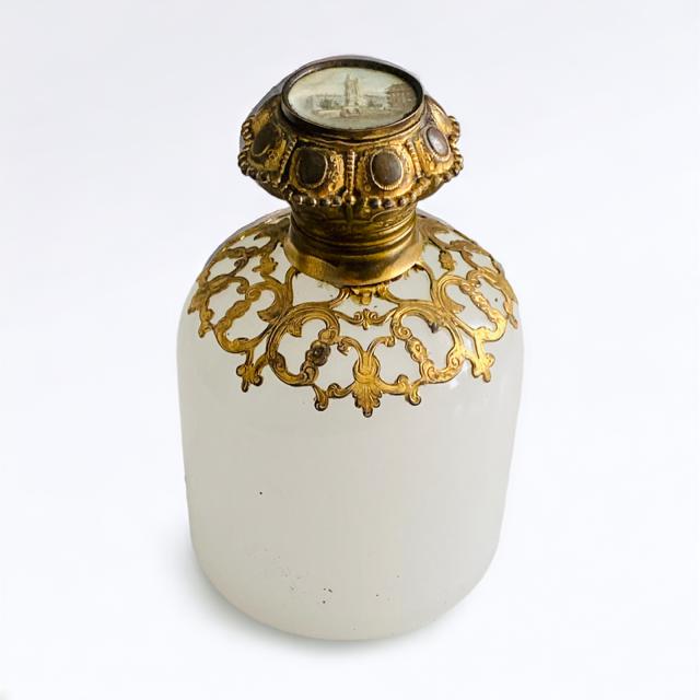 Antique French Grand Tour Souvenir Perfume Scent Bottle White Opaline Glass Gilt Ormolu Mount & Eglomise Miniature Painting Circa 1880