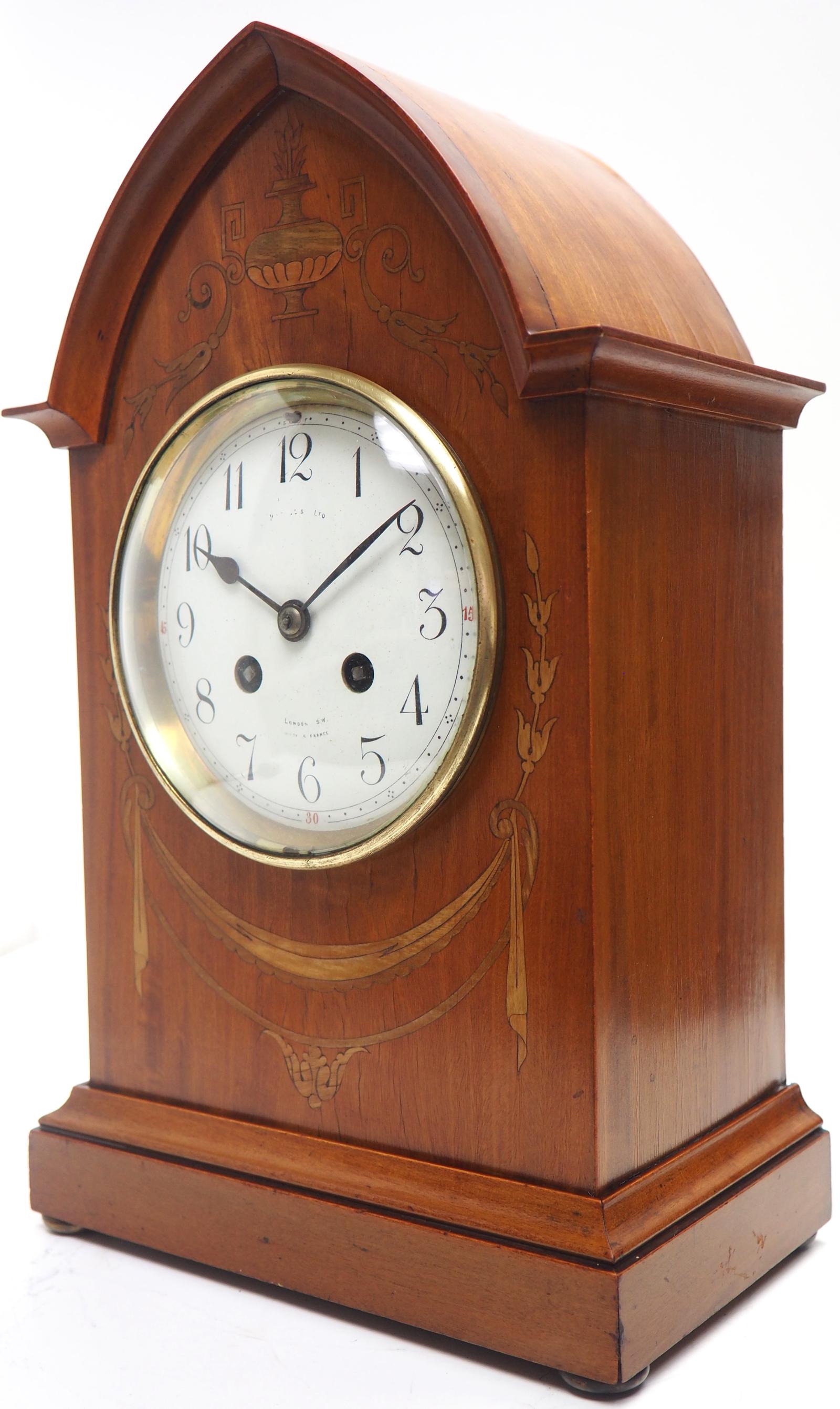 Antique French Inlaid Lancet Mantel Clock Multi Wood inlay 8 Day Striking Mantle Clock (1 of 9)