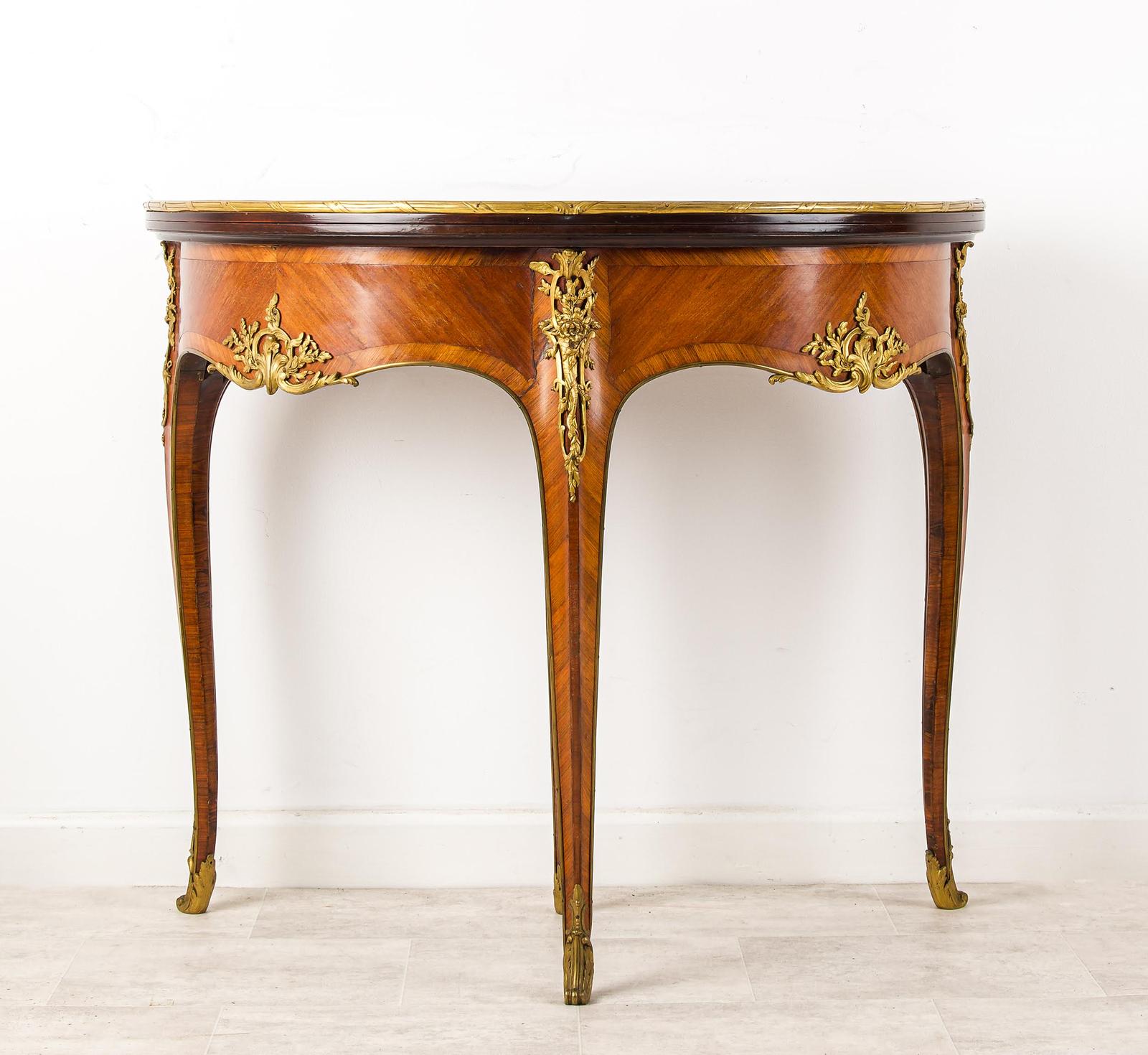 The shaped demi-lune top opens to reveal a green baize-lined playing surface, bordered by a polished kingwood surround. The frieze is finely contoured and enriched with exquisitely cast gilt-bronze mounts, displaying flowing acanthus scrolls and floral motifs characteristic of the Louis XV Revival aesthetic.