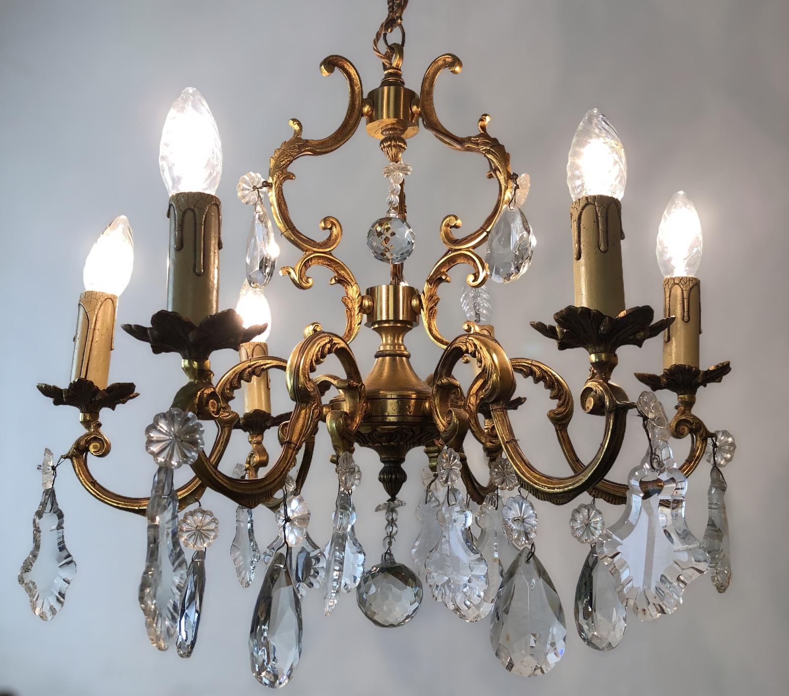 Antique French Large & Heavy Chandelier Gilt Bronze Ceiling Light with Crystal Droplets