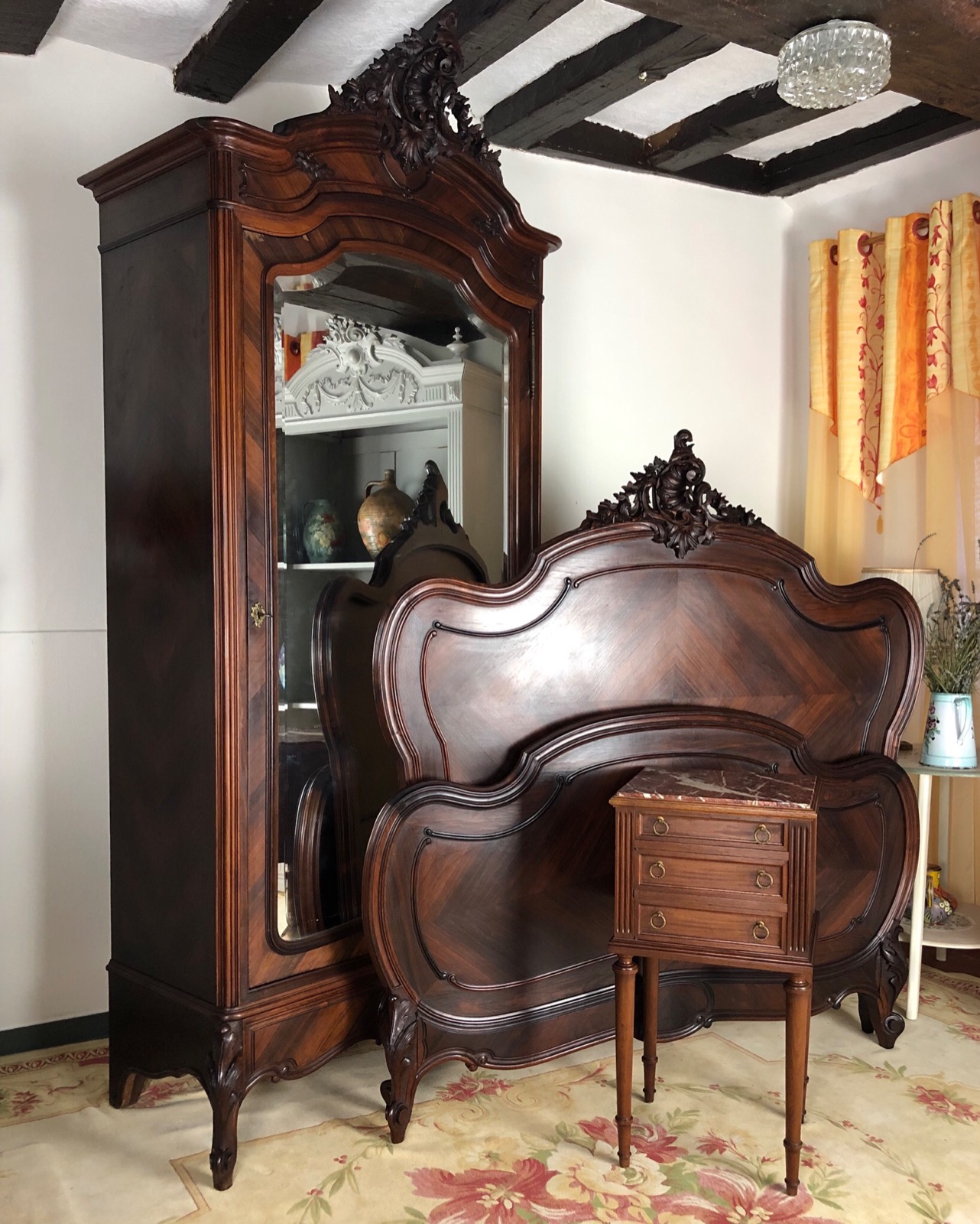 Antique French Louis Style Bedroom Suite Armoire Bed Frame & Cabinet