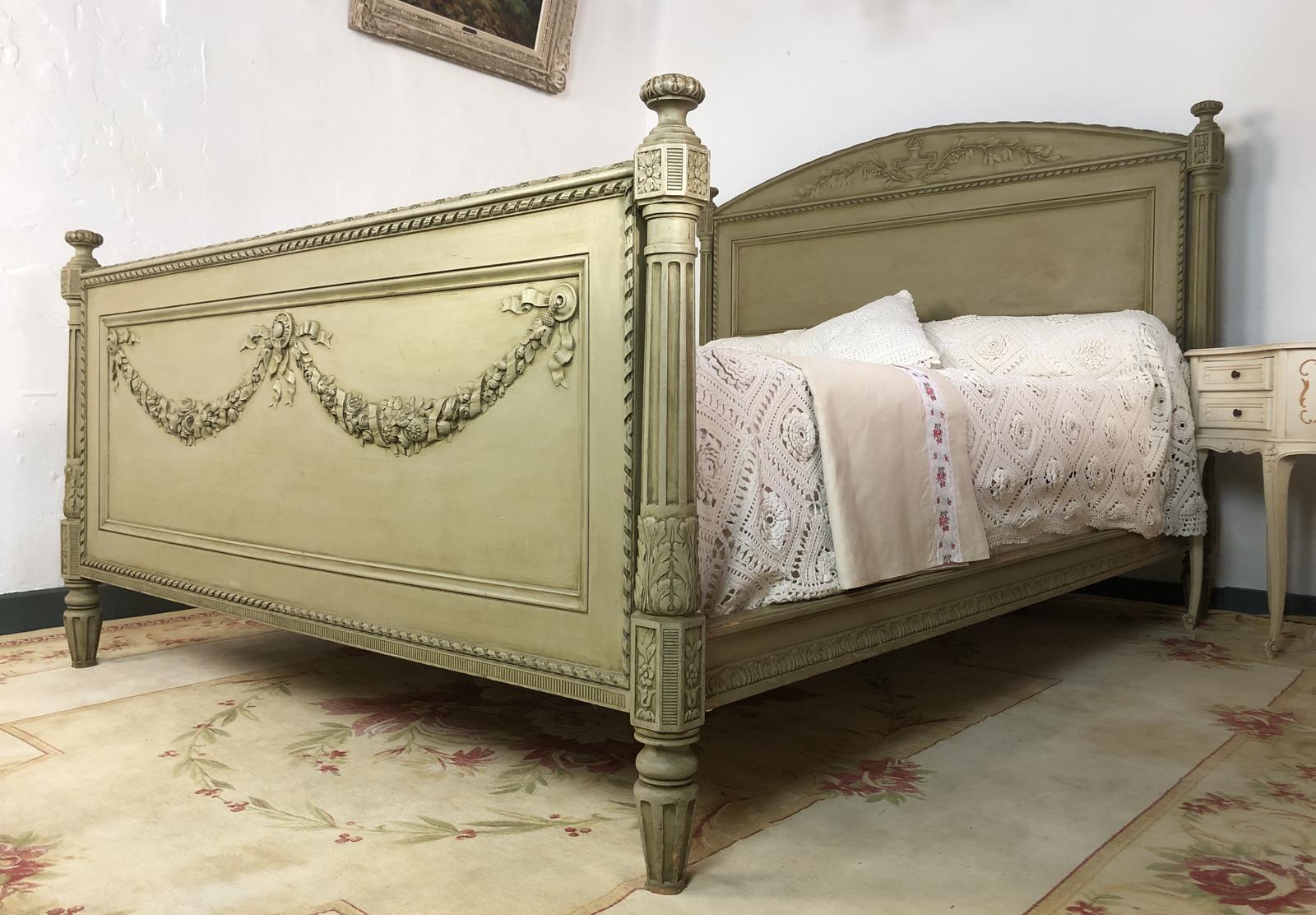 Antique French Louis Style King Size Bed Frame Original Rustic Olive Green Paint
