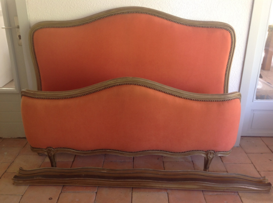 Antique French Louis XV Demi Corbeille Bed Red Coral Brushed Cotton Long Gilt Gilded Walnut