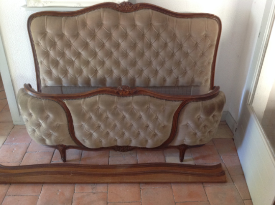 Antique French Louis XV Demi Corbeille Original Green Velvet Double King Size Long Natural Walnut