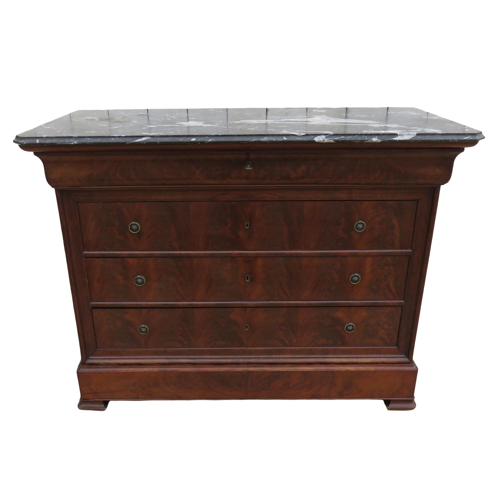 Shapely, sound and sturdy 19th century French five drawer Louis Philippe marble top and flame mahogany chest of drawers, commode. Key to pull open the top drawer only.