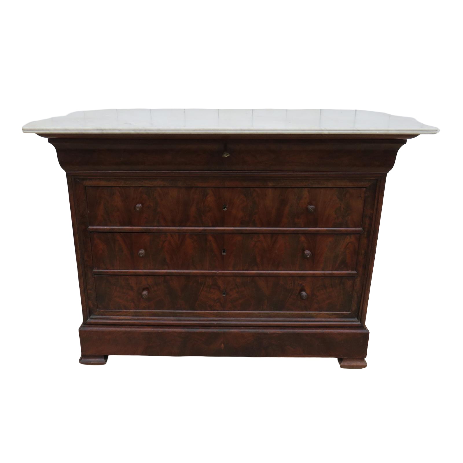 Shapely, sound and sturdy 19th century French five drawer Louis Philippe marble top and flame mahogany chest of drawers, commode. Key to pull open the top drawer only.